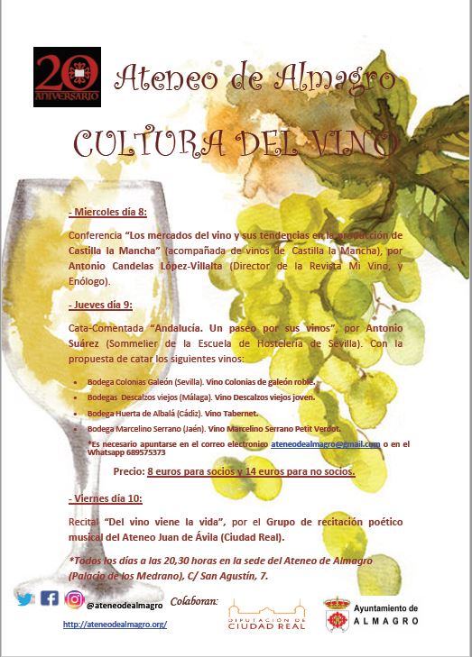 El Ateneo de Almagro ofrece esta semana tres propuestas que girarán en torno al vino, aprovechando la celebración de la Feria Nacional del Vino (FENAVIN) en la capital provincial. La sección Cultura del Vino ha organizado una conferencia, una cata y un recital que tendrán lugar en la nueva sede del Ateneo los días 8, 9 y 10 de mayo.