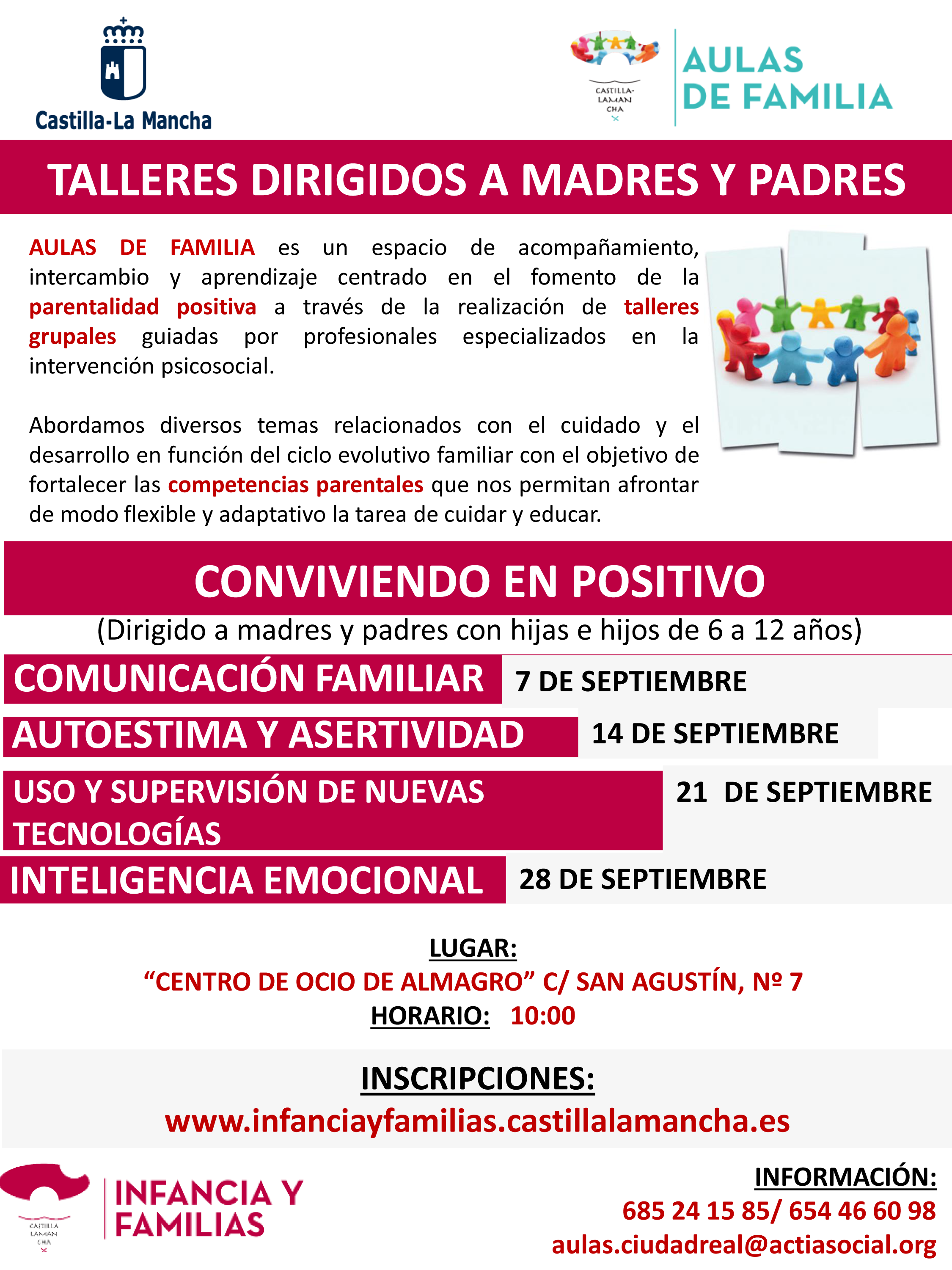 Las inscripciones se deben realizar en www.infanciayfamilias.castillalamancha.es Más información en la concejalía de la Mujer o en el correo centrodelamujer@almagro.es. También puede dirigirse al correo aulas.ciudadreal@actiasocial.org