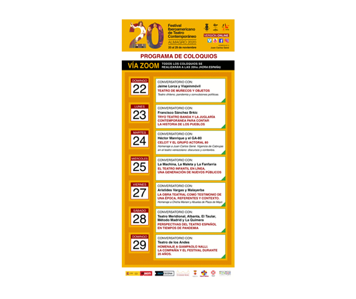 Del 20 al 29 de noviembre el Festival Iberoamericano de Teatro Contemporáneo de Almagro celebra su vigésima edición, este año en formato online, adaptándose a la coyuntura mundial y utilizando las herramientas que ofrecen las nuevas tecnologías. El festival tiene preparado una serie de eventos especiales para celebrar veinte ediciones ininterrumpidas y 45 años de creación del Centro Latinoamericano de Investigación y Creación Teatral, CELCIT. Entre los eventos destacan el homenaje al maestro Juan Carlos Gené, dramaturgo y director argentino; el homenaje a Chicha Mariani y Las Abuelas de la Plaza de Mayo por su labor incansable en mantener viva la memoria; y siete coloquios temáticos que se efectuarán a las 20 horas (España) los días 22,23,24,25,27,28 y 29 de noviembre a través de la plataforma Zoom. En la página celcit.es en el apartado Eventos especiales/ Coloquios con las compañías participantes cualquier persona en cualquier lugar del mundo podrá obtener gratuitamente los enlaces y códigos de acceso para participar en los foros de su interés los días programados, sólo debe hacer un click sobre el cartel y copiar el link para unirse a la reunión de Zoom. Los coloquios versarán sobre temas que están sobre el tapete en el ámbito mundial, como el futuro del teatro en tiempos de pandemia, la virtualidad y el teatro infantil, las convulsiones políticas y la cultura, así como la trayectoria de directores, dramaturgos y agrupaciones emblemáticas tales como Juan Carlos Gené, José Ignacio Cabrujas y el Grupo Actoral 80 de Venezuela; Arístides Vargas de Teatro Malayerba de Ecuador, o Giampaolo Nalli, fundador del Teatro De Los Andes de Bolivia.