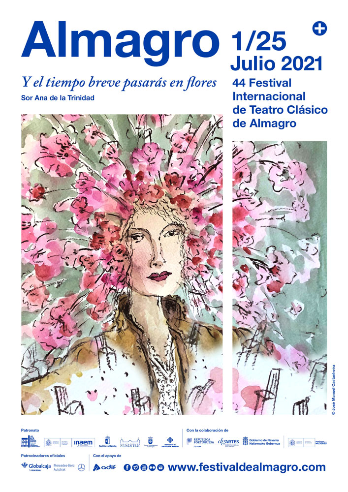 Castanheira se ha inspirado en el verso de Sor Ana de la Trinidad, Y el tiempo breve pasarás en flores, y que es una declaración de intenciones de lo que queremos que el público disfrute en Almagro. El artista portugués ha inventado esa mujer florida, esa mujer teatral, esa mujer que es observada por esas sillas parecidas a las del Corral de Comedias y que encarna ese valor de esperanza y de un tiempo nuevo que, sin duda, va a representar esta edición del Festival.