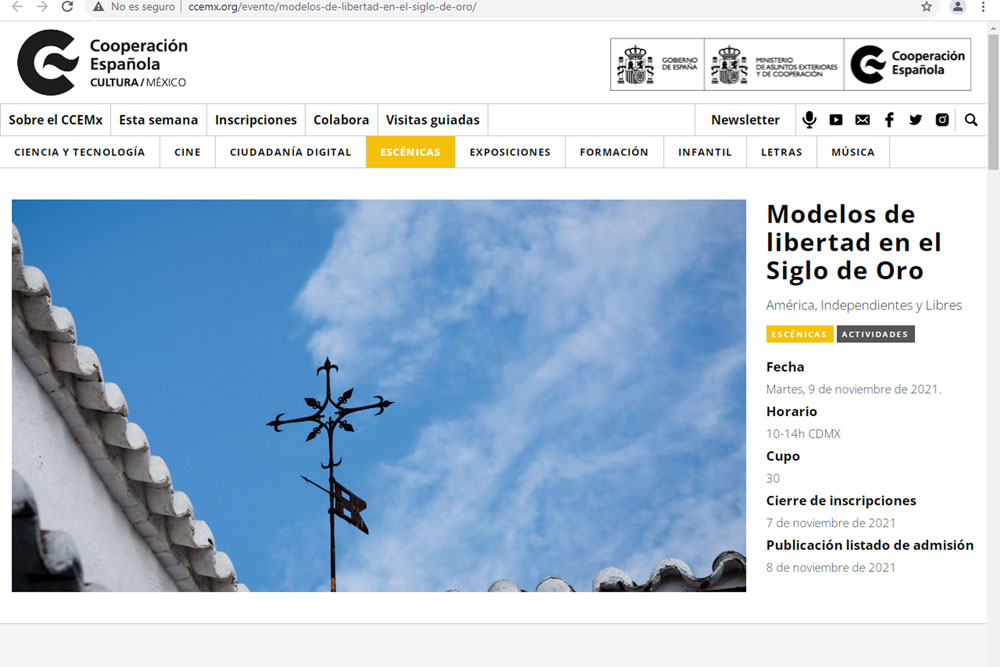 Presentación, en formato de lecturas dramatizadas digitales, de 4 monólogos escritos por autores mexicanos en torno al Siglo de Oro a partir de las ideas de libertad e independencia desde una perspectiva contemporánea. Un proceso creativo destinado a profesionales de la escena y la dramaturgia mexicana, cuya finalidad es bucear los textos del Siglo de Oro en español, la presencia de figuras que son modelo de independencia y libertad, y que anticipan el pensamiento que sustento el movimiento independentista de 1821. Actividad dirigida por Aurora Cano, creadora escénica y directora de la compañía mexicana Teatro de Babel.