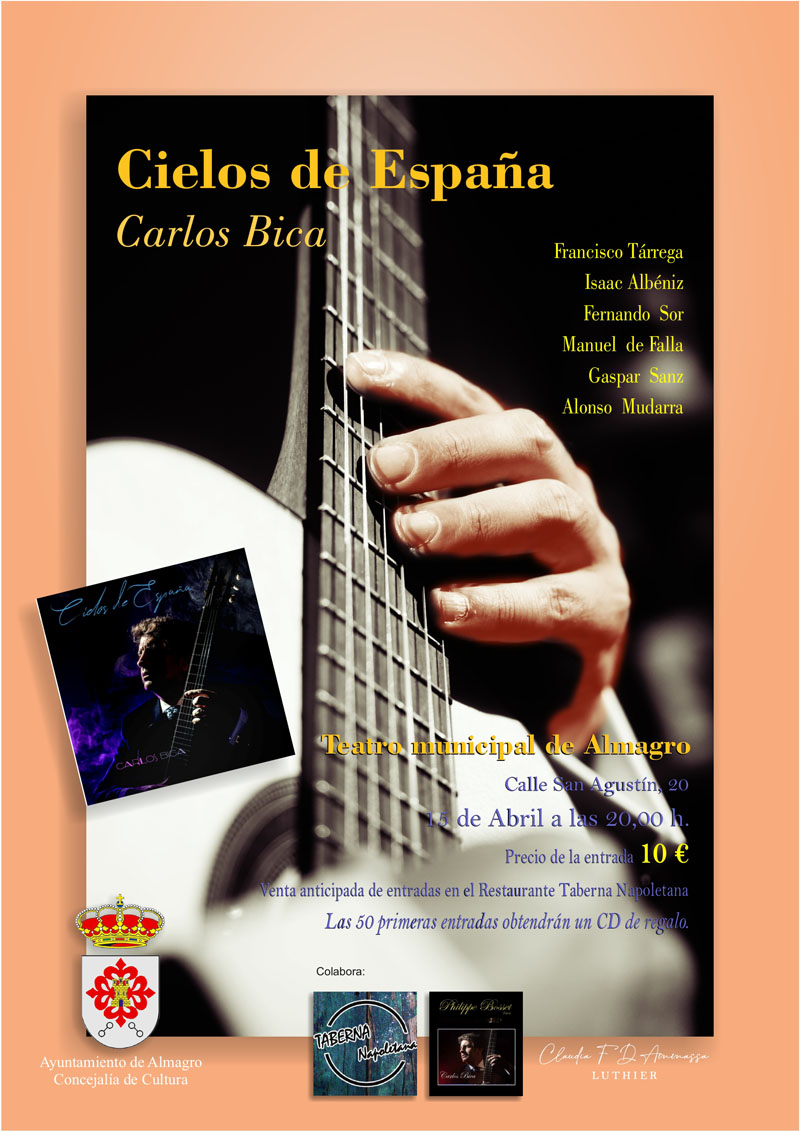 El guitarrista brasileño Carlos Bica presenta este viernes en el Teatro Municipal su disco 'Cielos de España. Un recorrido por la historia de la música y de la guitarra que es, al mismo tiempo, un viaje y un retrato de la cultura española. A través de la composición de Tárrega, Sor, Gaspar Sanz, Albéniz muestra la cultura española, desde el siglo XVI hasta hoy pasando por las lindas composiciones del final del Siglo XIX e inicio del Siglo XX. Es un viaje con la guitarra por los cielos de La Mancha, un agradecimiento a la acogida recibida en España. “Nunca vi un cielo tan lindo cuando salía al campo a caminar y tocar la guitarra, ha sido mi inspiración para crear este CD”, dijo Carlos Bica en la entrevista en Onda Almagro.
