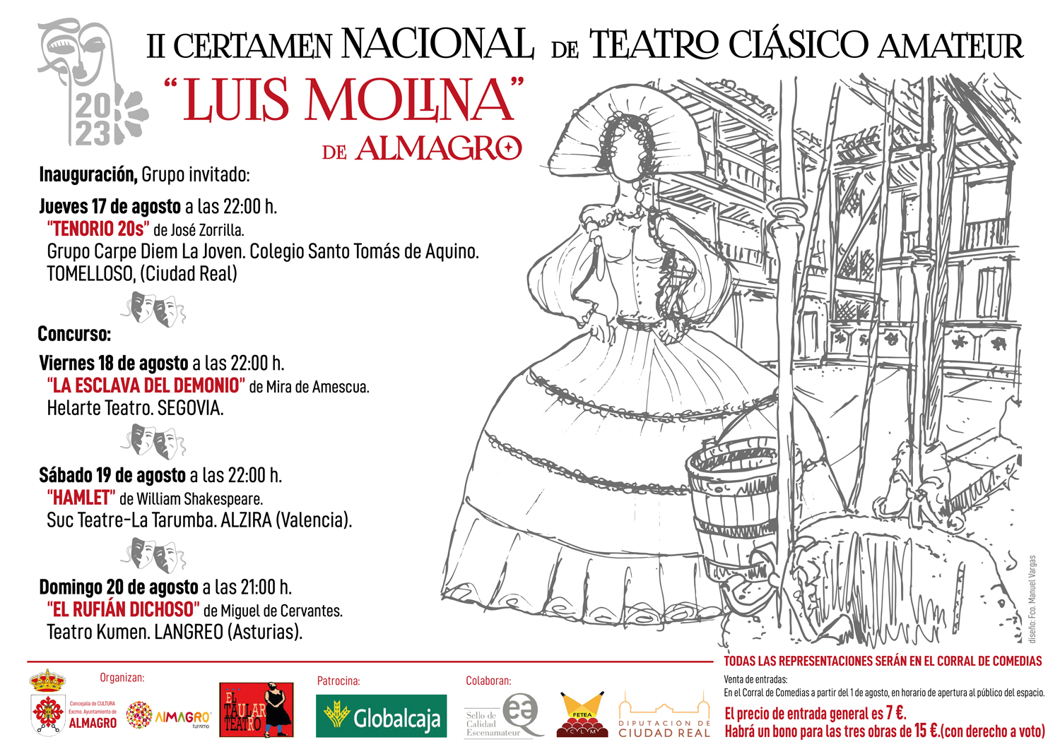 La programación oficial comenzará con La esclava del demonio de Mira de Amescua de Helarte Teatro. (Segovia) a las 22h del viernes 18 de agosto. Continuará el sábado 9 de agosto con Hamlet de William Shakespeare de Suc Teatre-La Tarumba de Alzira (Valencia) y finalizará el domingo 20 de agosto a las 21:00 horas con el El rufián dichoso de Miguel de Cervantes por Teatro Kumen de Langreo (Asturias)