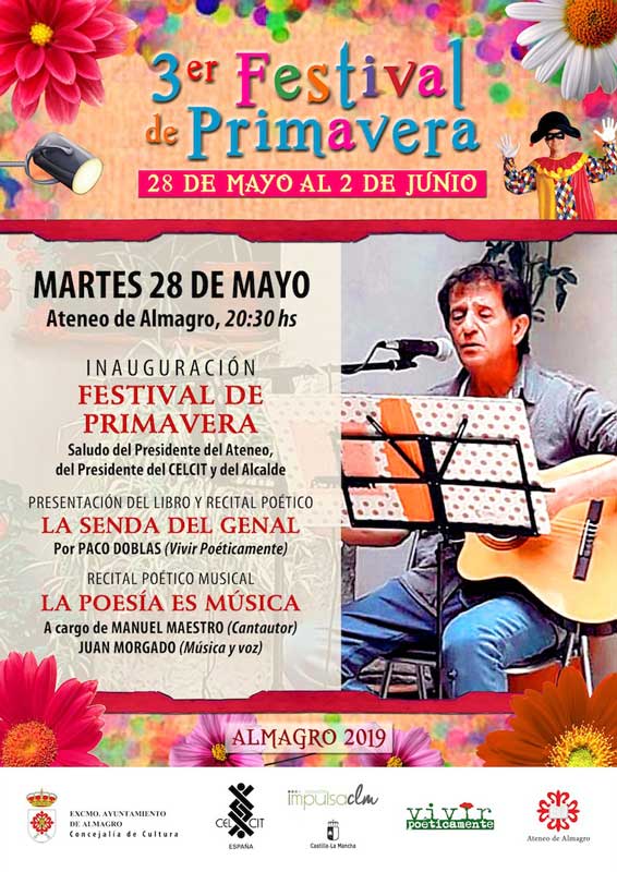 La tercera edición del Festival de Primavera arranca hoy, martes 28 de mayo. El acto inaugural será en el Ateneo a las 20:30 horas. El colectivo Vivir Poéticamente presentará el libro “La senda del Genal” a cargo de Paco Doblas. Posteriormente, tendrá lugar un recital poético-musical a cargo de Manuel Maestro y Juan Morgado. A partir de este momento, Almagro vivirá un semana para festejar la primavera coincidiendo con el 65 aniversario de la recuperación y reapertura del Corral de Comedias. El acto institucional tendrá lugar el miércoles 29 de mayo. Precisamente un 29 de mayo de 1954 reabrió sus puertas tal y como lo vemos hoy. Y todos los 29 de mayo, Almagro recuerda esta fecha. Este próximo miércoles, el concejal de Cultura, Pedro Torres, leerá el mensaje del Día del Corra. Il Parnaso Musicale cerrará el acto con un concierto de música barroca.