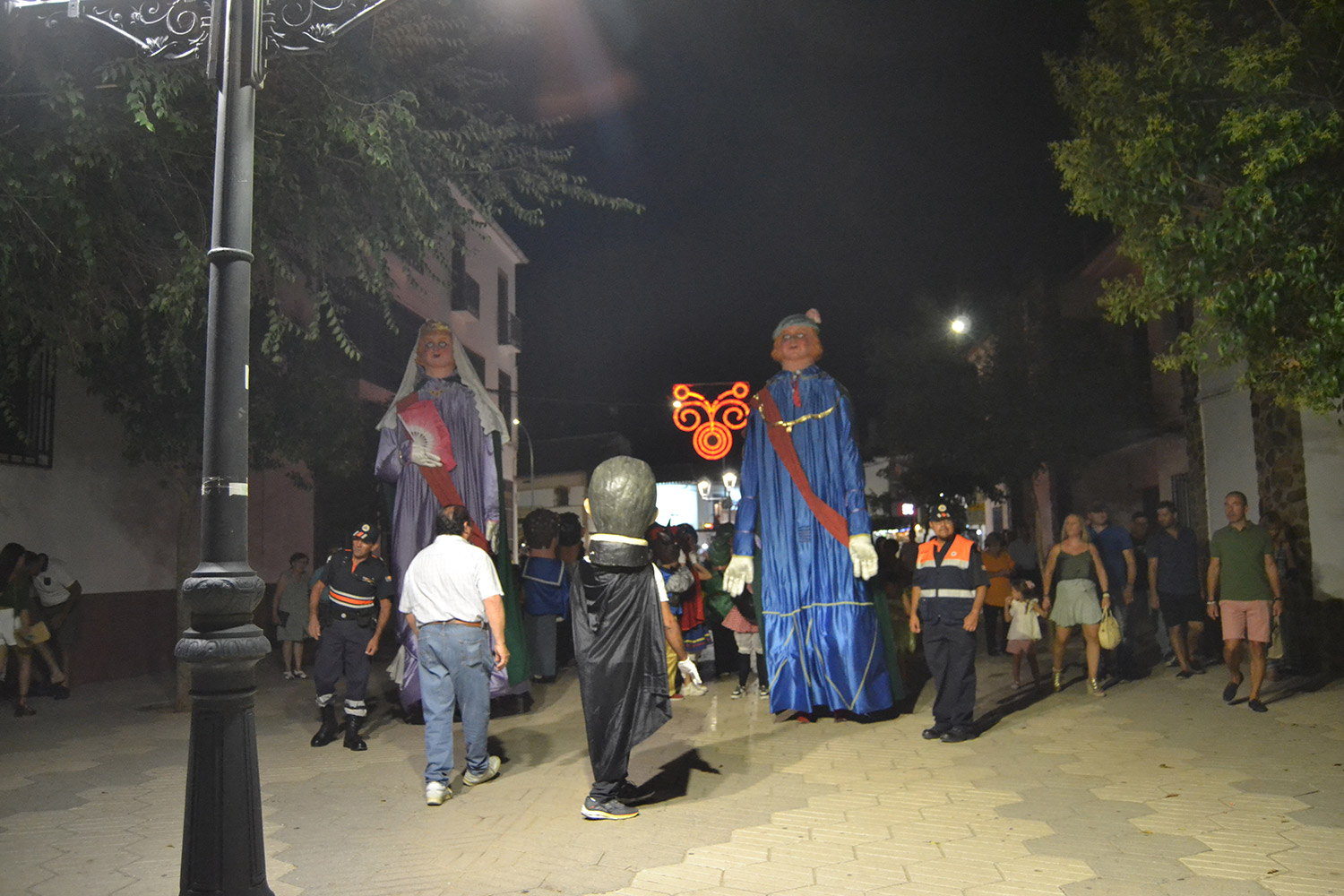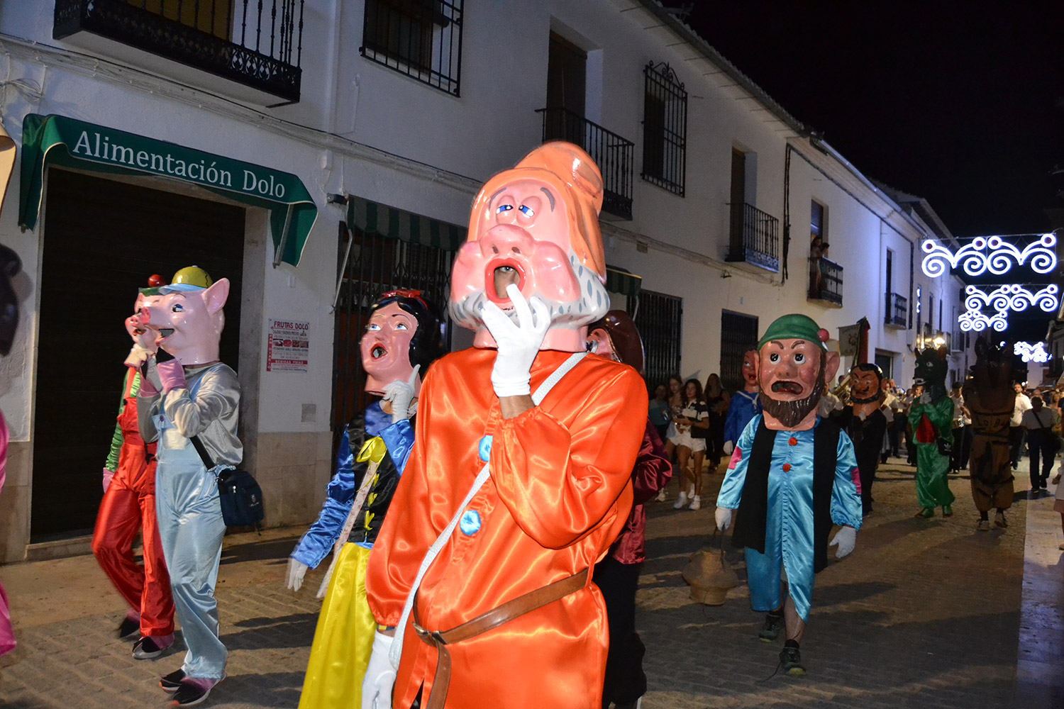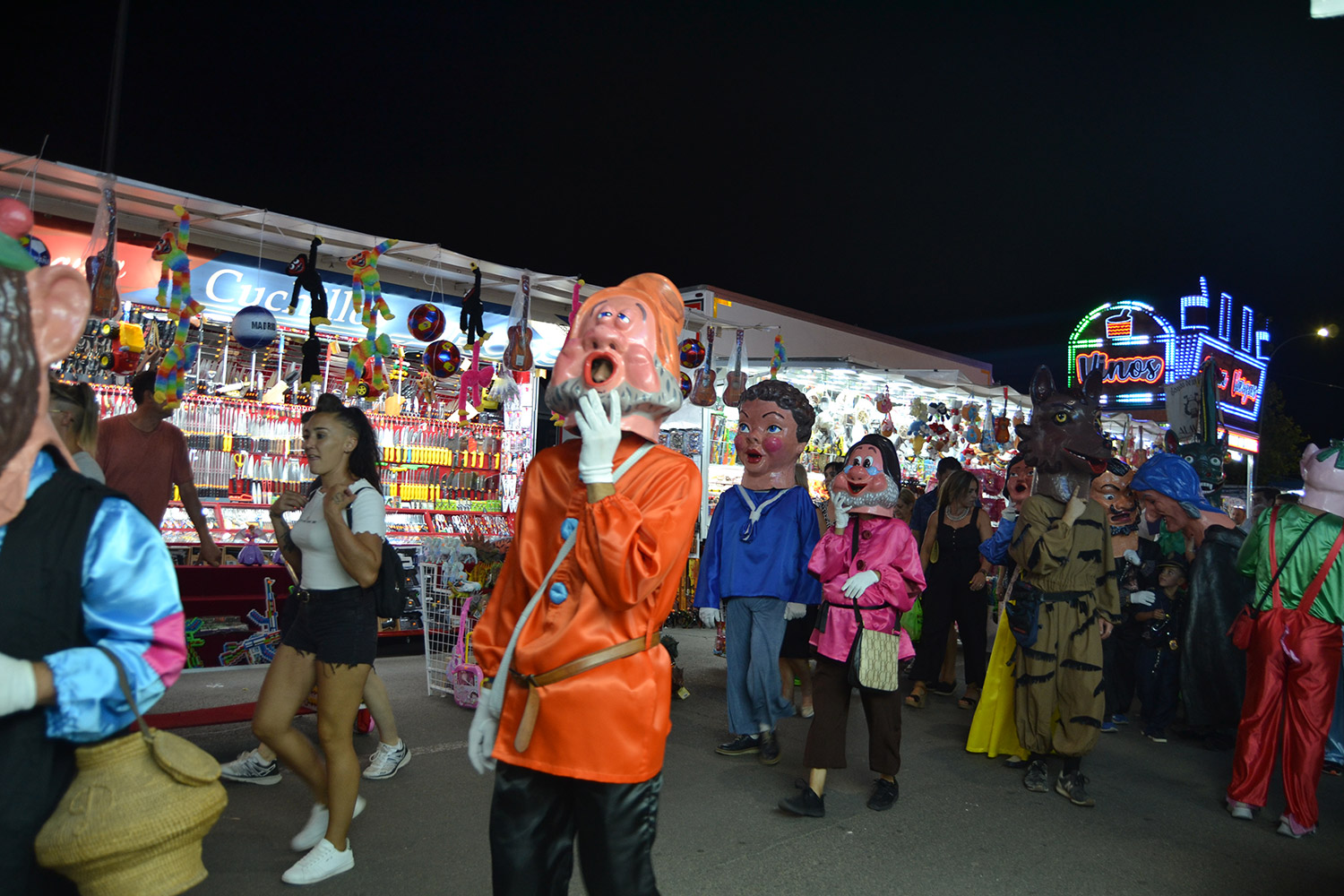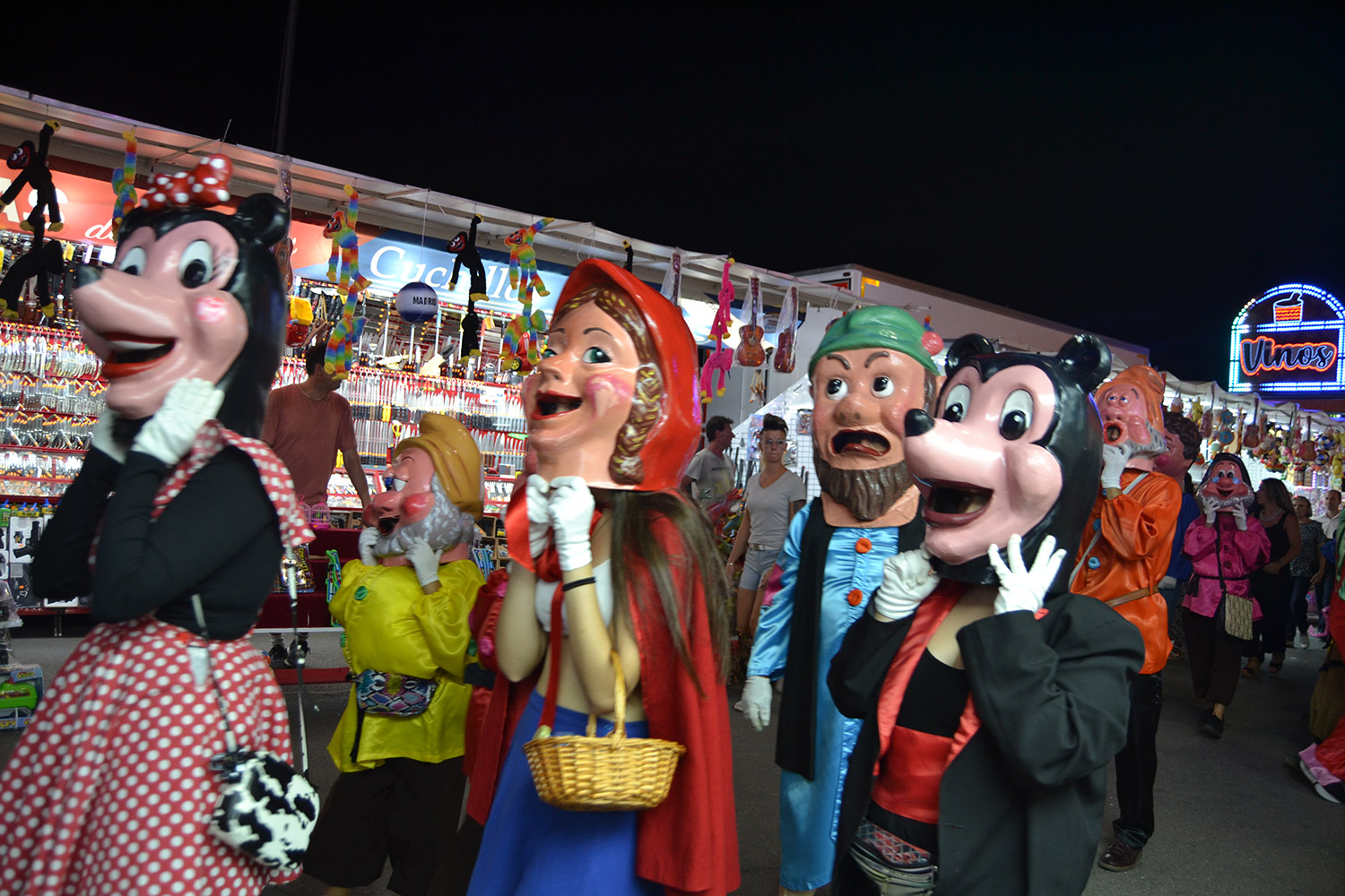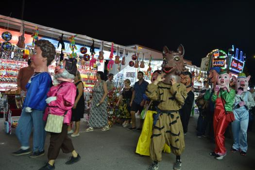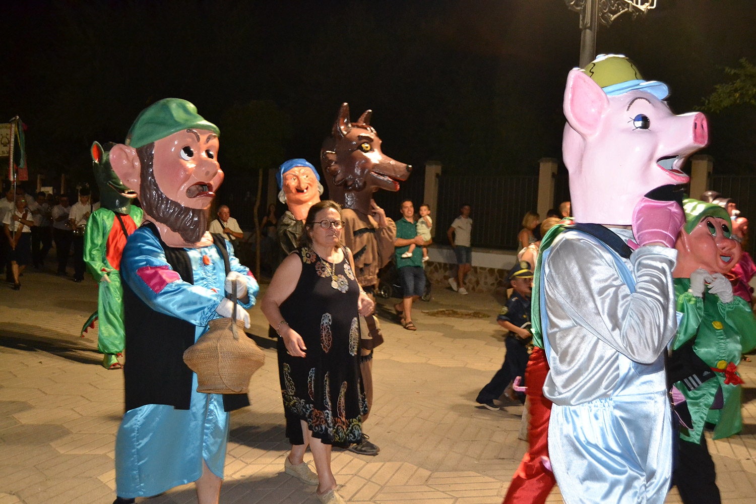 El primer acto oficial de la Feria dio paso al desfile de gigantes y cabezudos, que acompañaron a la comitiva de Reina, damas y zagales, autoridades locales y provinciales y a los muchos vecinos, sobre todo niños, que no quisieron perderse el desfile hasta el recinto ferial. En su arco de entrada, la Reina cortó la cinta inaugural y con ello, el encendido de luces y los fuegos artificiales.