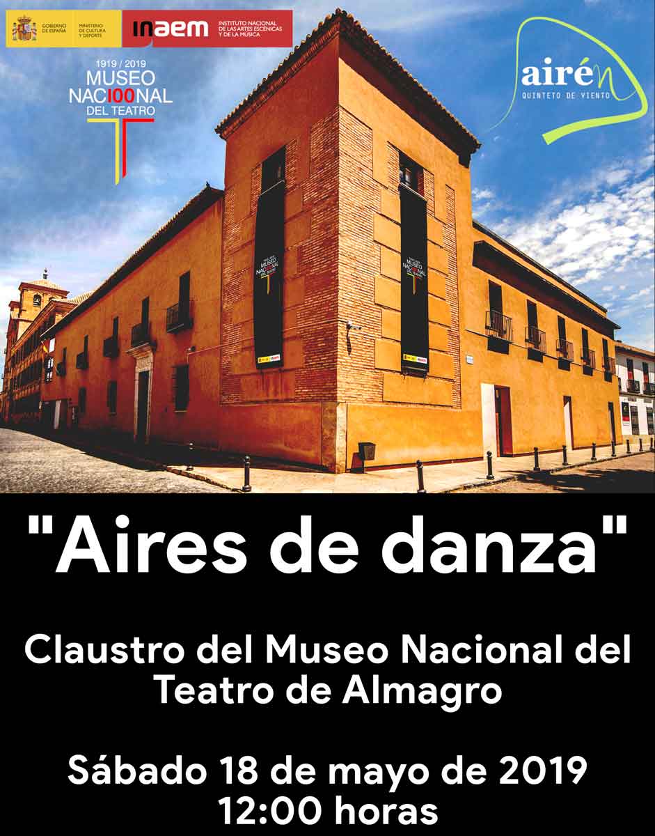 El Museo Nacional del Teatro celebra el día de los Museos con el concierto “Aires de danza” por el quinteto de Viento “Airén” de Ciudad Real. Está formado por cinco jóvenes músicos con la inquietud común de interpretar repertorio para esta formación camerística. Comienzan sus primeros ensayos a finales del año 2008, dando su primer concierto en el Conservatorio “Marcos Redondo” de Ciudad Real. Del mismo modo continúan ofreciendo conciertos en diversos puntos de la geografía castellano manchega y en otras salas de la geografía nacional, como el Museo de Bellas Artes de Badajoz.
