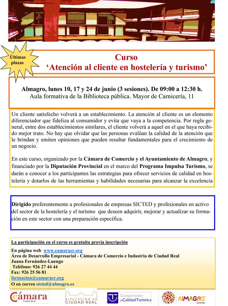 Con el objetivo de conocer las herramientas básicas para un buen servicio y una atención al cliente de calidad, la Cámara de Comercio e Industria de Ciudad Real y la Diputación Provincial en colaboración con el Sistema Integral de Calidad Turística de Almagro-SICTED- de la Concejalía de Turismo del Ayuntamiento de Almagro del Destino Almagro ha organizado el curso “Atención al cliente actual en hostelería y turismo”.