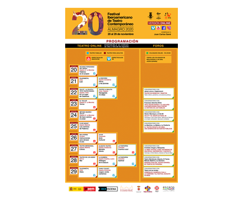 Durante diez días, del 20 al 29 de noviembre de 2020, amantes de las artes escénicas de todo el mundo podrán disfrutar de una extraordinaria muestra del mejor teatro contemporáneo de habla hispana. Bajo la premisa ¡Conéctate al teatro y deléitate!, el público podrá acceder a los espectáculos, conversatorios y eventos especiales a través del sitio web celcit.es y los enlaces colocados en las redes sociales Instagram y Facebook del festival. Las visualizaciones de los espectáculos para público adulto e infantil, estarán disponibles durante 24 horas a través de la plataforma virtual de VIMEO; con sólo un click se podrán adquirir las entradas y obtener el enlace para disfrutar de la función. También se ofrecerán espectáculos gratuitos por YouTube. Además, la 20ª edición del Festival tiene preparada una serie de actividades especiales, entre ellas, siete coloquios temáticos a través de Zoom, homenajes a Juan Carlos Gené fundador del CELCIT; a Chicha Mariani y las Abuelas de Plaza de Mayo; y a Giampaolo Nalli, fundador del Teatro De Los Andes. Este año participan agrupaciones de Chile, Colombia, Cuba, Venezuela, Ecuador, Bolivia y España. Un recorrido por el mejor teatro contemporáneo de Latinoamérica y España, honrando la participación de compañías emblemáticas dentro del festival que a lo largo de estas dos décadas han visitado Almagro, maravillando a lugareños y foráneos.