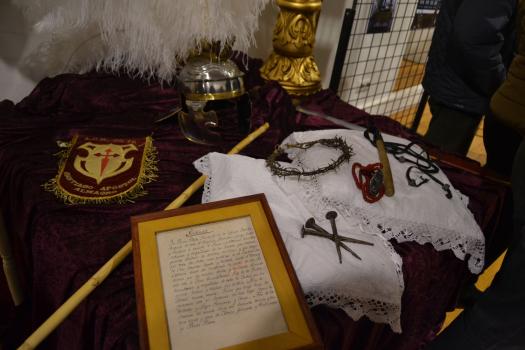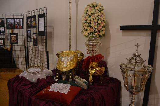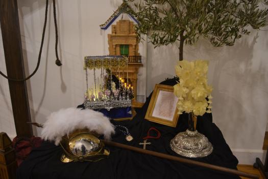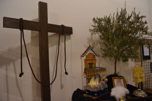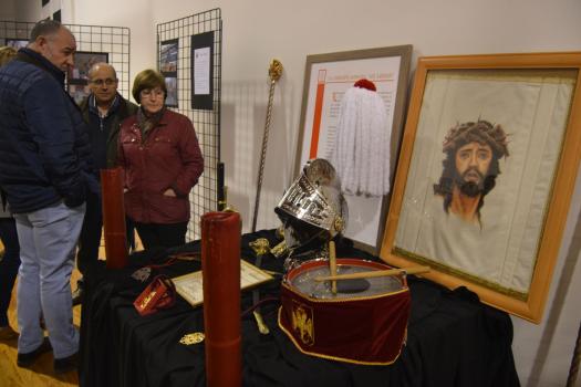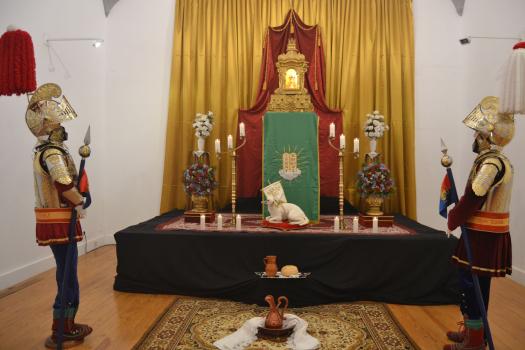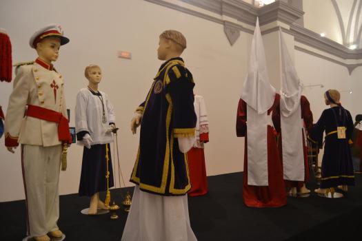 La exposición, que estará abierta hasta la finalización de la Semana Santa, se ha divido en dos partes fundamentalmente. Una primera dedicada a las hermandades. Unos paneles explican quienes son. Unas fotografías muestran su fe en la calle y en unas mesas exponen elementos que podemos ver en sus procesiones. La segunda parte se refiere a la participación de los niños en las procesiones. Se ha colocado maniquíes con las túnicas de las seis hermandades de Almagro y vestimentas que portan los pequeños de las cofradías. Y al fondo, el sagrario, el Monumento, el altar que se expone cada Jueves Santo en el convento de las monjas de clausura de la orden dominicana, custodiado por los Armaos y recreado como se suele ver, con velas para dar solemnidad y con los elementos que hablan de la institución de la Eucaristía, pan, vino, jarra, mesa, toalla… Es una de las señas singulares de la Semana Santa de Almagro. Varios templos de la ciudad exponen sus Monumentos custodiados por una pareja de soldados romanos de la Compañía Romana.