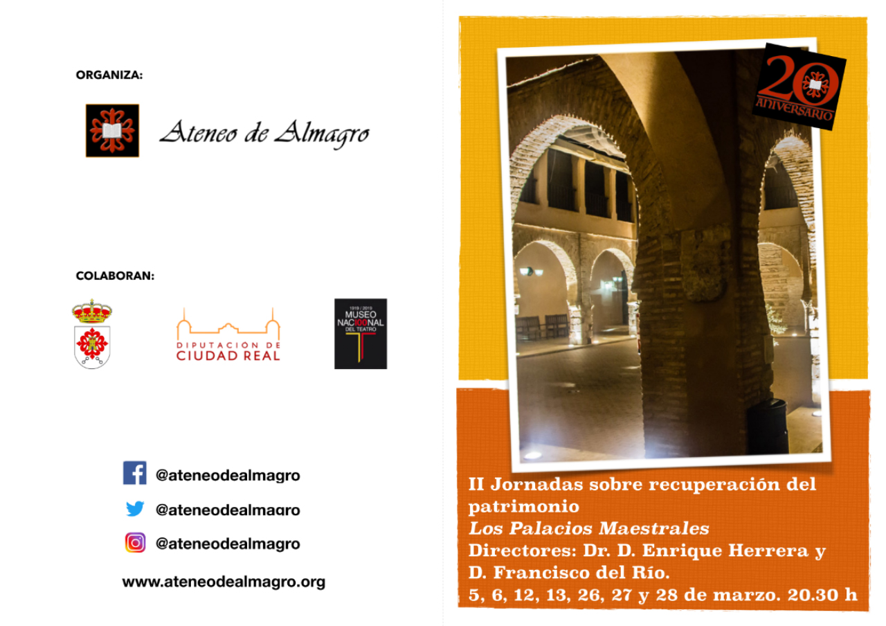 Los Palacios Maestrales que sirvieron como residencia de los diferentes maestres de la Orden Militar de Calatrava y que actualmente albergan las instalaciones del Museo Nacional del Teatro, serán el edificio en torno al cual se vertebrarán las seis conferencias previstas los días 5, 6, 12, 13, 26 y 27 de marzo, y que se celebrarán en la sede del Ateneo de Almagro (Palacio de D. Jerónimo de Ávila). Por último el día 28 se ofrecerá una visita guiada por Enrique Herrera en el interior de los Palacios Maestrales.
