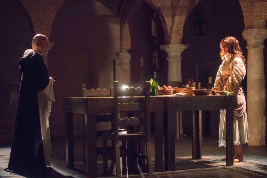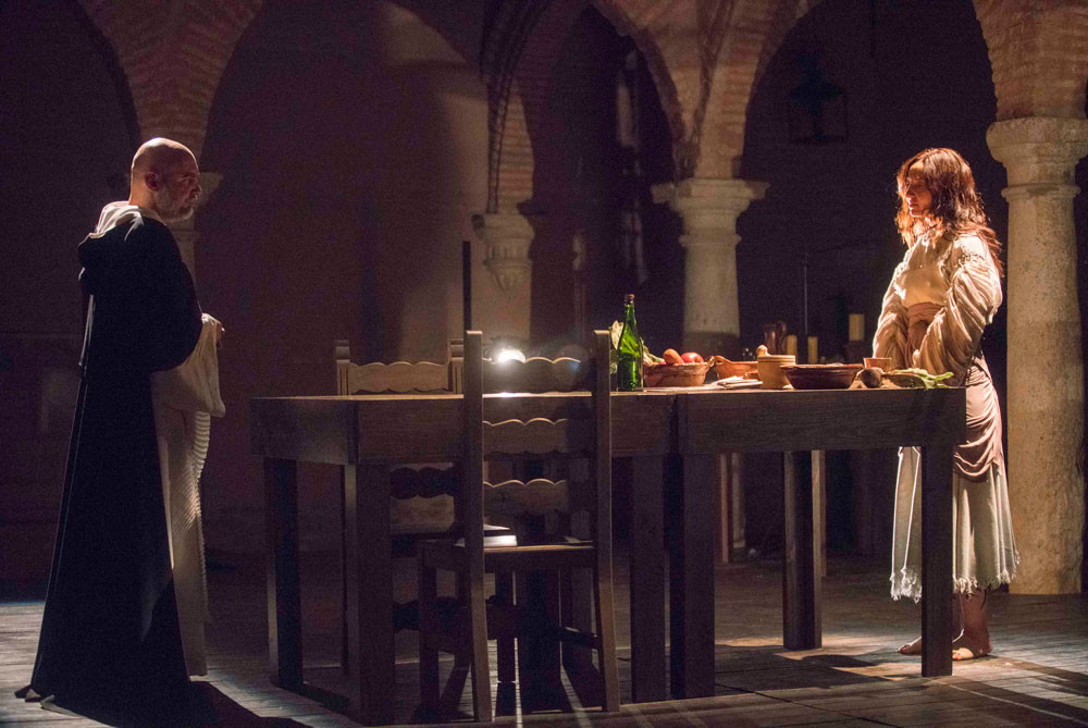 El texto de Juan Mayorga es de una enorme riqueza lingüística. El español antiguo en el que está escrito plantea un juego con la palabra y la música que es uno de los ejes rectores de esta puesta en escena. El otro es la cocina. A lo largo de su vasta obra, Santa Teresa a menudo habla de huertos, recetas, y como “entre pucheros anda Dios”. El encuentro entre Santa Teresa y el Inquisidor sucede mientras ella está cocinando para sus hermanas en el monasterio de San Jose. La puesta en escena utiliza la cocina para plantear un juego sensorial entre ambos personajes y el espectador. No solo veremos el encuentro entre ambos personajes, sino que el olor de la cocina de Santa Teresa envolverá dicho encuentro.