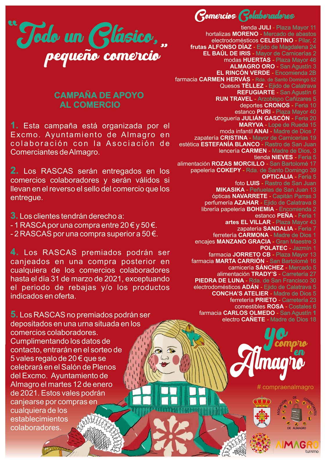 Los comercios participantes son: tienda Juli; Hortalizas Moreno; Frutas Alfonso Díaz; Quesos Téllez; Alimentación Rozas Morcillo; carnicería Sánchez; Trady's; comestibles Rosa; Almagro oro; Opticalia; ópticas Navarrete; Electrodomésticos Celestino; electrodomésticos J.Adán; electrodomésticos Cañete; el Baúl de Iris; Modas Huertas; Refugiarte; Cronos; Maryva; Anai; zapatería Cristina; Carmen; Tienda Nieves; Mikasika; Sandalias; Artes El Villar; Encajes Manzano Gracia; Concha's Atelier;Piedra de Luna; El Rincón verde; centro estética Estefanía Blanco; perfumería Azahar; droguería Julián Gascón; Run Travel; estanco Puri; estanco Peña; Foto Luis; Cokepy; librería papelería Bohemia; ferretería Prieto; ferretería Carmona; Polatec; farmacia Jorreto; farmacia Marta Carrión; farmacia Carmen Hervás y farmacia Carlos Olmedo