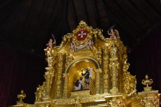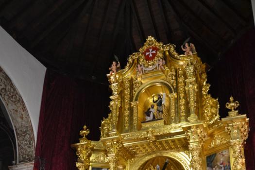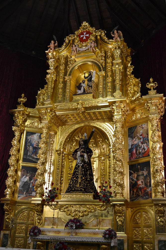 Es de estilo barroco. Cuatro lienzos narran la vida de este santo a ambos lados de la parte central en la que se sitúa la imagen del titular de la hermandad almagreña, Jesús de las Tres Caídas. Decorado con columnas doradas y ornamentadas con figuras y detalles propias del estilo barroco, el retablo se corona con la imagen de San Juan ý con una frase en latín “Juan es su nombre” y la cruz de San Juan.