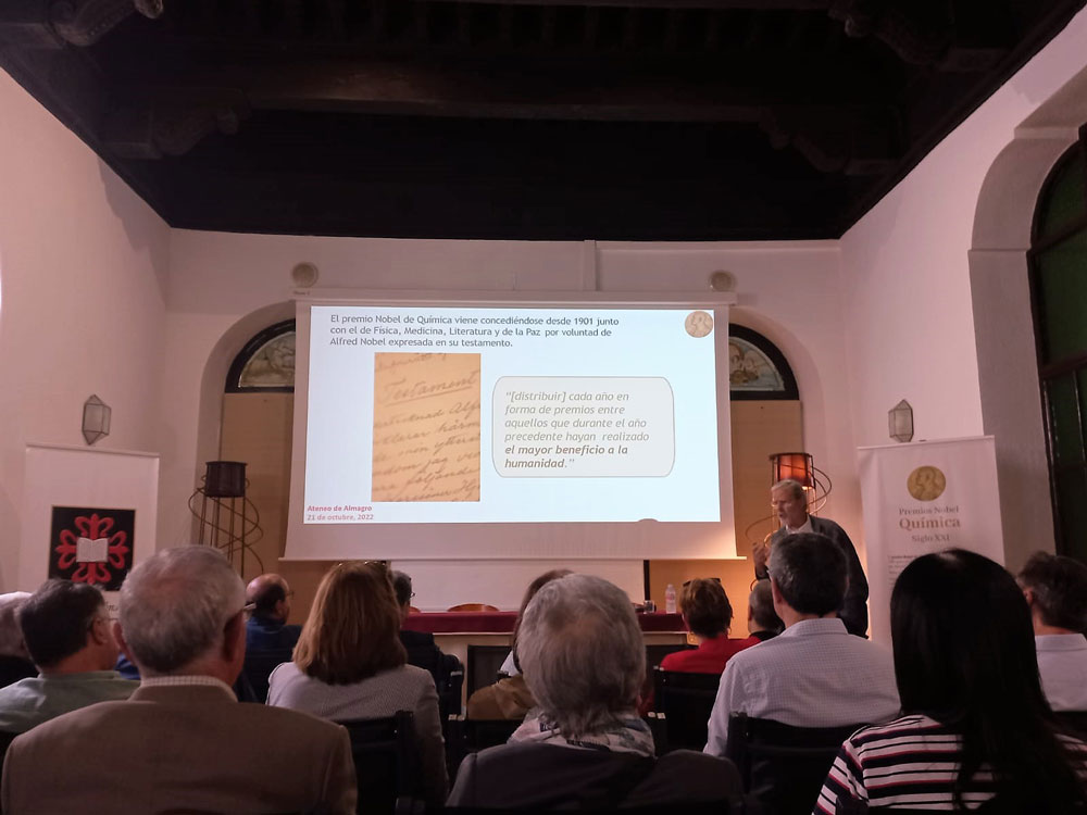 Además, prestó especial atención a las cinco mujeres que en el S.XXI han recibido el Nobel (más que todas las mujeres que lo recibieron en el siglo pasado). También se detuvo en los principales logros alcanzados en los desarrollos científicos concretos de las investigaciones de los Premios Nobel que se han podido visitar en la Exposición que ha permanecido en el Ateneo de Almagro durante las dos últimas semanas, así como en las modernas aplicaciones que los descubrimientos tienen en el ámbito de la medicina y elaboración de fármacos. Avances muy importantes en el estudio del ADN, con un reconocimiento especial a Francisco J. Martínez Mojica, cuyo descubrimiento con la identificación de la secuencia CRISPR en microorganismos como sistema de defensa contra los virus fue el punto de partida que permitió la concesión del Nobel a las dos investigadoras que después lo recibieron por sus progresos en el funcionamiento celular. Y, finalmente, realizó un recorrido por la trayectoria profesional de algunos de los premiados con presencia en la Exposición “Los Premios Nobel de Química del S.XXI”.