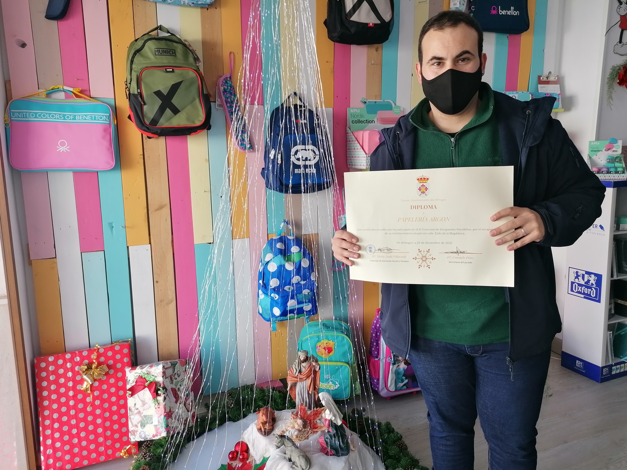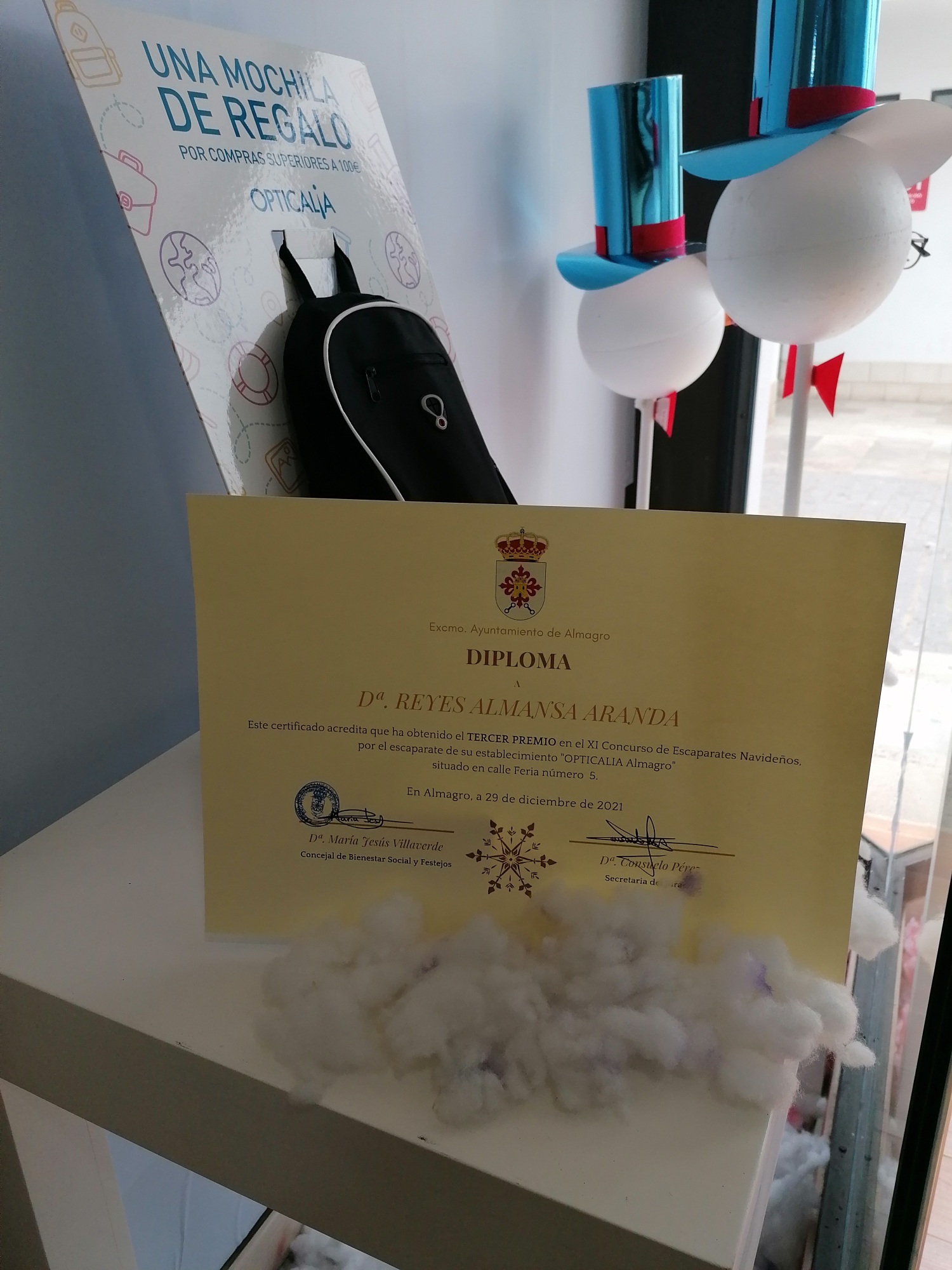 La concejal de Promoción Económica del Ayuntamiento de Almagro, María Jesús Villaverde, ha entregado hoy los premios del XI concurso de escaparates navideños. La farmacia de Carlos Alberto Olmedo ha conseguido el primer premio. Belén Olmedo ha recibido esta mañana el cheque por valor de 150 euros, el paquete de 30 cuñas para Onda Almagro y el diploma. Anai, tienda de ropa infantil y la óptica Opticalia se han hecho con el segundo y tercer premio, respectivamente. Han recibido también esta mañana, el cheque de 100 y 50 euros, paquete de cuñas y diploma.