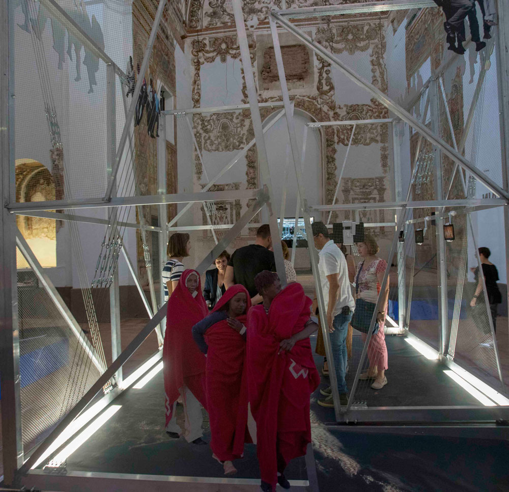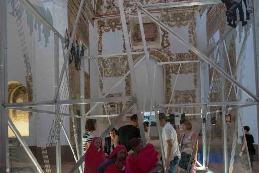 El visitante que entre en la iglesia de San Agustín encontrará este concepto representado por una estructura que desde el primer momento te conduce a la realidad de cientos de personas que buscan mejorar su calidad de vida saltando una valla.