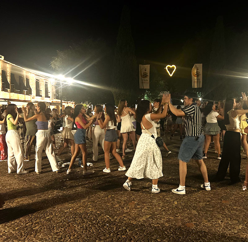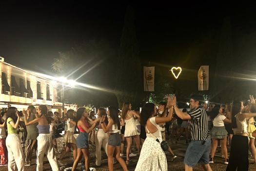 A su término, la Escuela de Baile Raúl volvió a inundar la Plaza ayor con su energía y buenas vibraciones, transmitiendo mucho amor en una cita que ya se ha consolidado como un evento esencial de La Noche Romántica. En esta actividad participan no solo los alumnos, sino también sus familias, amigos y visitantes, quienes se suman a este gran baile colectivo que llena la plaza de ritmo y besos. Precisamente, a las doce de la noche, la Plaza Mayor y los alrededores de la ermita de San Juan se llenaron de besos: los “besos más bonitos del mundo”, acompañados por el encendido de la hoguera, en presencia del alcalde Francisco Ureña y un espectáculo de fuegos artificiales que marcaron simbólicamente el inicio de solsticio de verano y de la noche más larga del año.