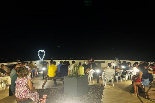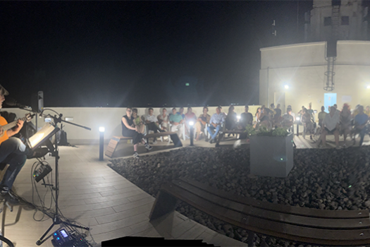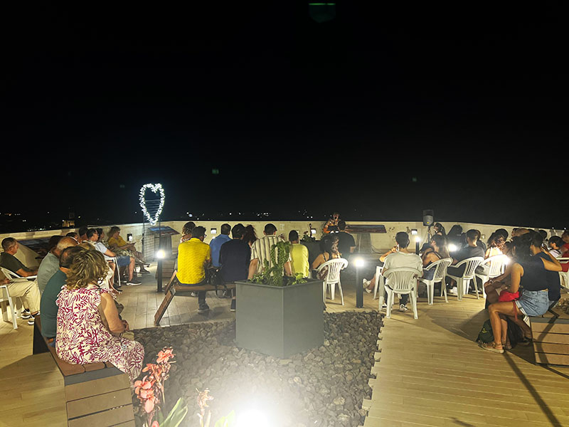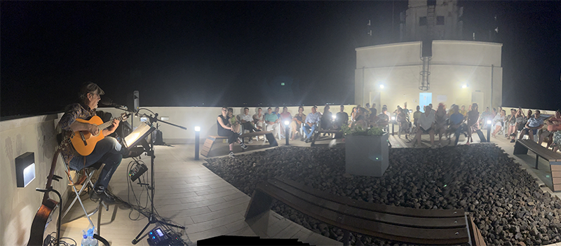 Ya al anochecer, el mirador del Silo abrió de forma extraordinaria para acoger una velada íntima con vistas al Campo de Calatrava, donde cerca de 150 personas disfrutaron del concierto acústico del artista Roberto Mendés. Un photocall instalado para la ocasión permitió inmortalizar el momento con Almagro como telón de fondo. Aunque el viento fue un invitado inesperado, provocando anécdotas como partituras volando o instrumentos caídos, el ambiente romántico y festivo se mantuvo intacto.