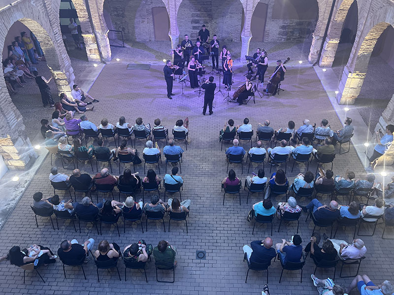 El patio del Museo Nacional de las Artes Escénicas fue otro de los lugares románticos de este pasado sábado en el que un centenar de personas asistieron al concierto de la CLM Sinfónica, que ofreció un repertorio especialmente seleccionado para la ocasión, en un espacio que realzó el carácter solemne y emotivo de la interpretación de piezas de Granados, Albéniz, Guerrero, Serrano y Soler.