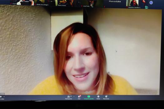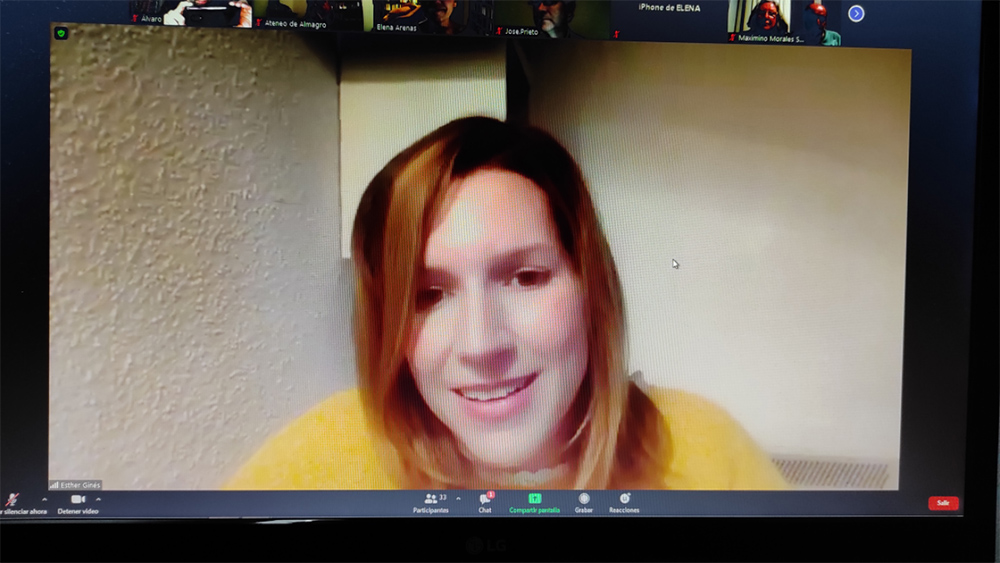 Esther quiso agradecer al Ateneo su invitación, recordando su primera visita en 2017, presencial en aquel momento, para presentar su segunda novela. Tras compartir con los espectadores telemáticos un vídeo promocional de Mares sin dueño, quiso explicar algunas líneas argumentales de la novela.