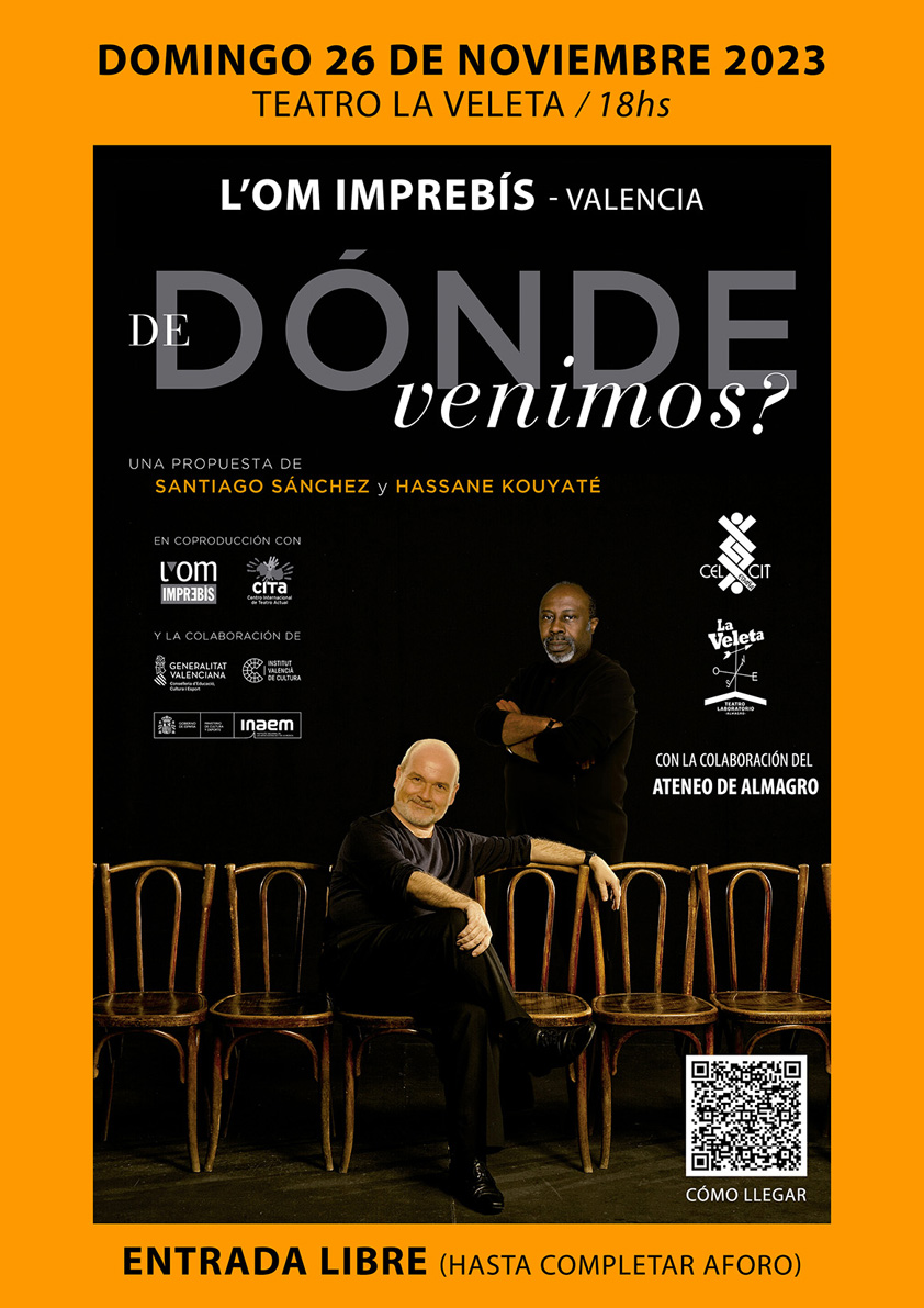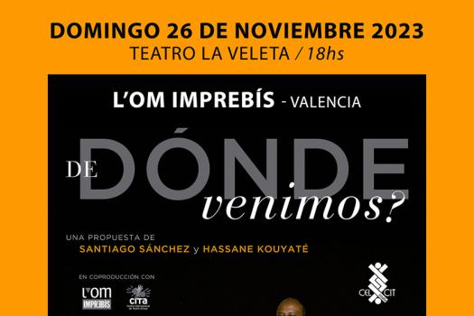 El próximo domingo 26 de noviembre a las 18.00 horas, el Teatro Laboratorio La Veleta culmina su programación de 2023 con la presentación de la afamada compañía L’Om Imprebís y el pre estreno de su último montaje “¿De dónde venimos?”, una colaboración entre Santiago Sánchez y Hassane Kouyaté.
