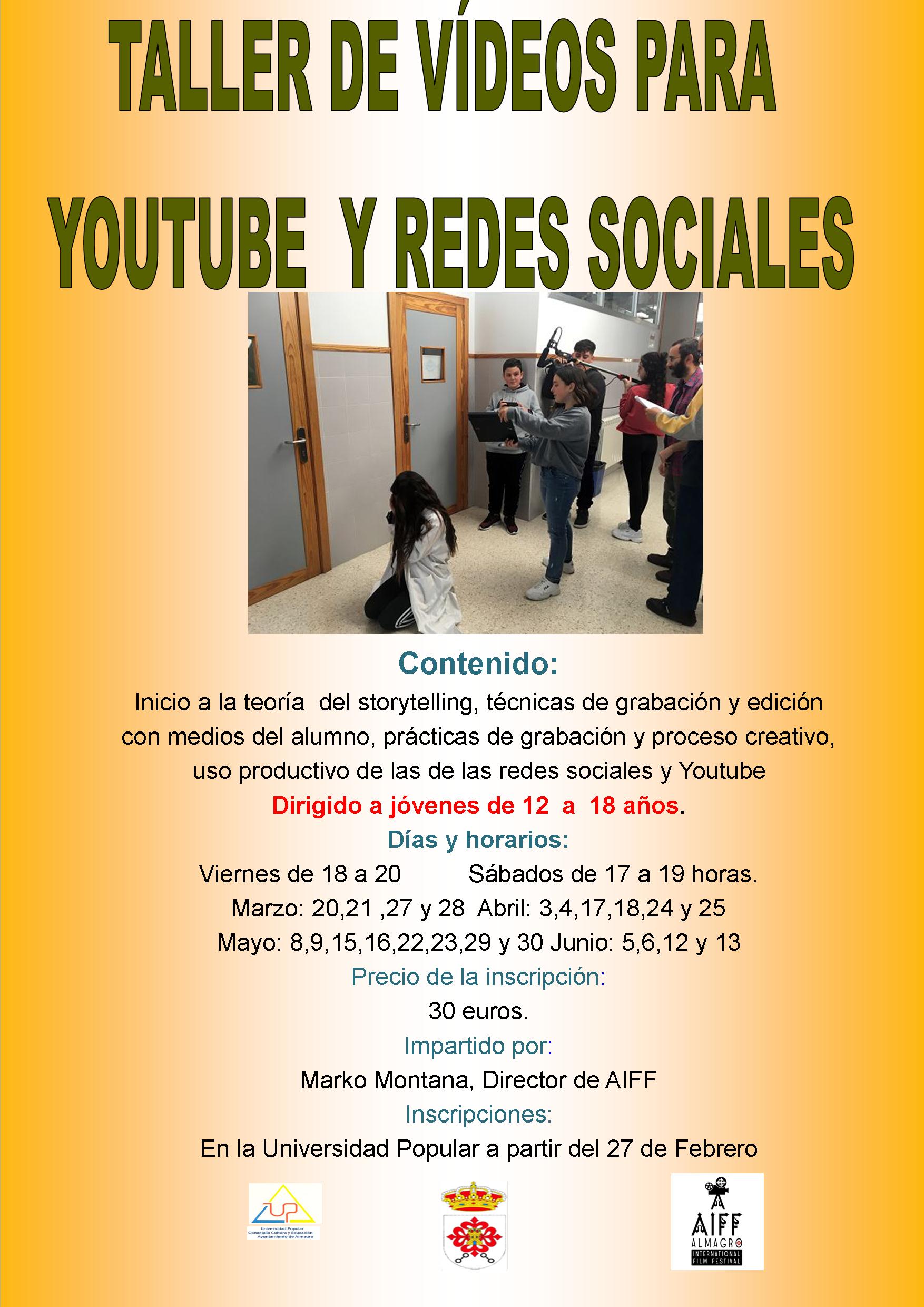 El segundo taller es para iniciarse en la teoría del storytelling, técnicas de grabación y edición, el uso productivo de las redes y de youtube para los jóvenes de 12 a 18 años. El curso se impartirá en dos días en sesiones de dos horas, los viernes y los sábados desde este próximo viernes 20 de marzo.