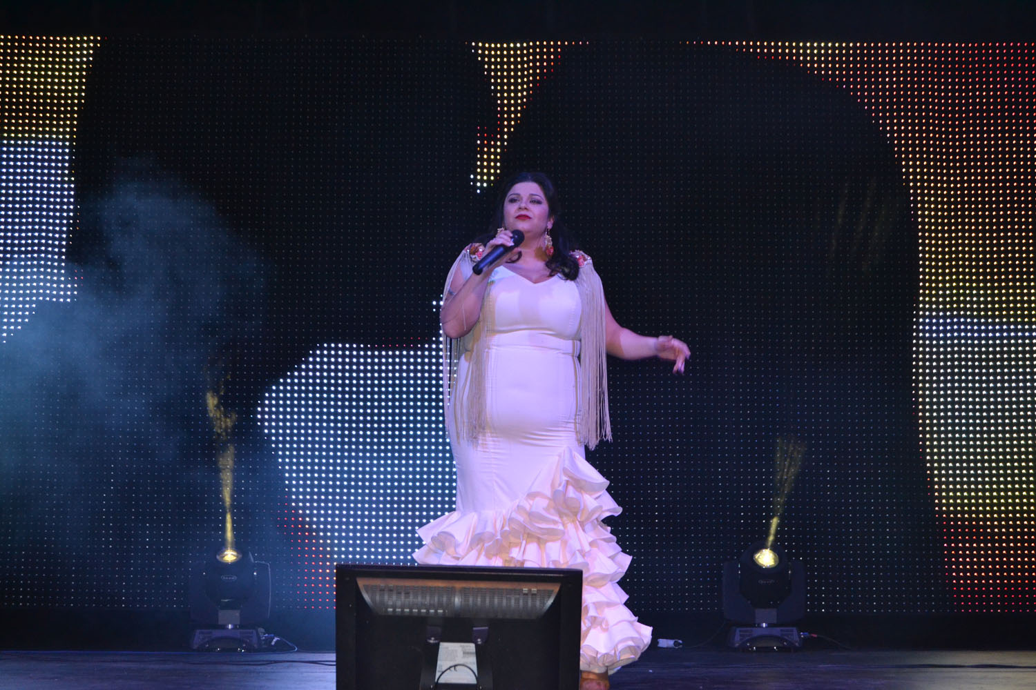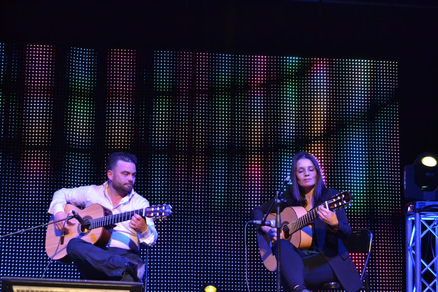 La gala benéfica de Navidad, presentada por Álvaro Ramos, comenzó con la actuación de Fernando Téllez. El artista y técnico almagreño fue también el responsable del despliegue de luz y color del escenario que sorprendió y gustó a los asistentes. A continuación, música flamenca de la mano de Maribel Arroyo, José Enrique Bautista(guitarra), Juan Ramón Ayllón (cajón) y Elena Bautista (guitarra). Como muestra el conocido tema de Paco de Lucia, “Entre dos aguas” o el fandango “Qué no daría yo…”