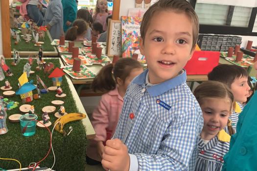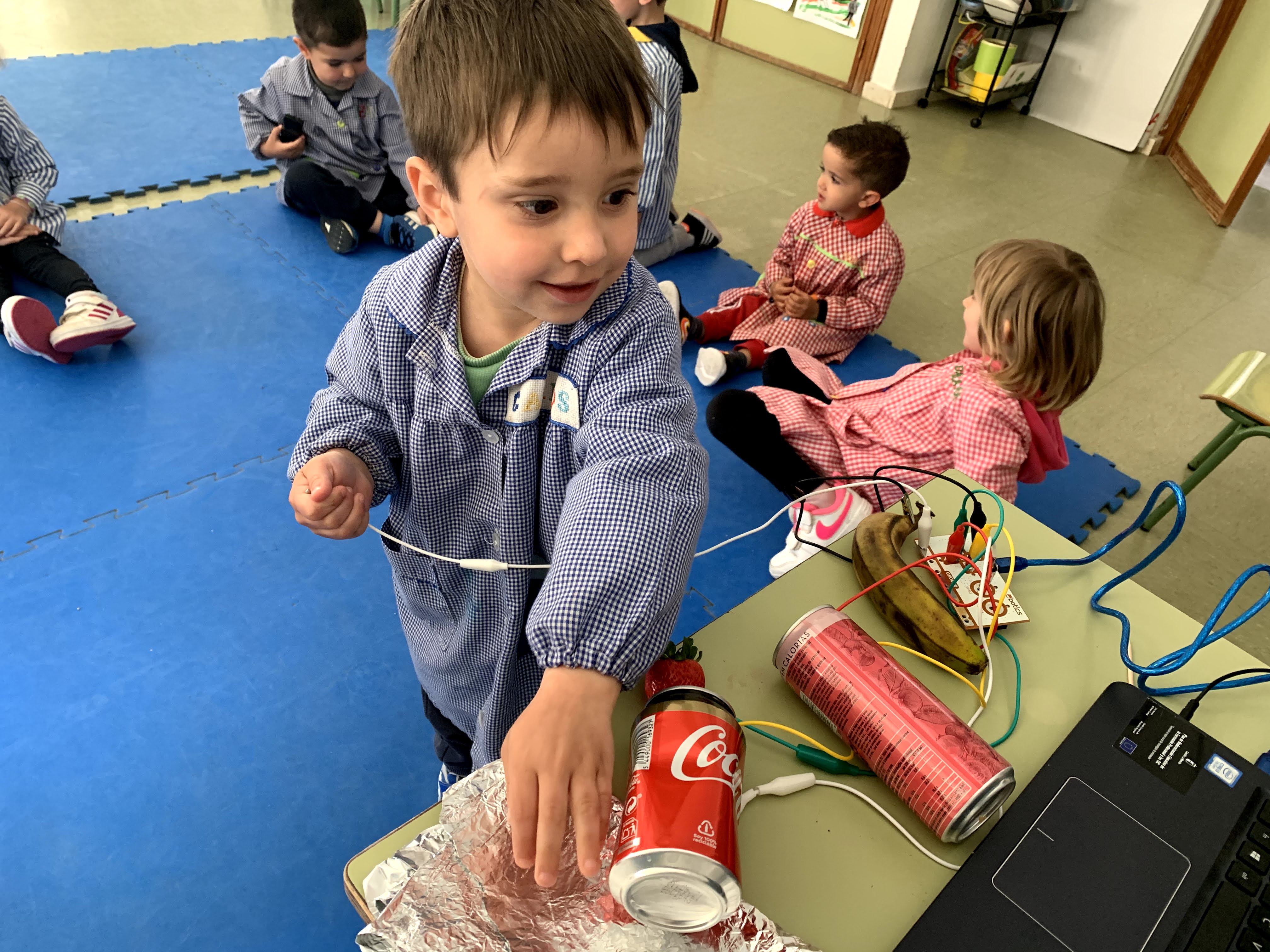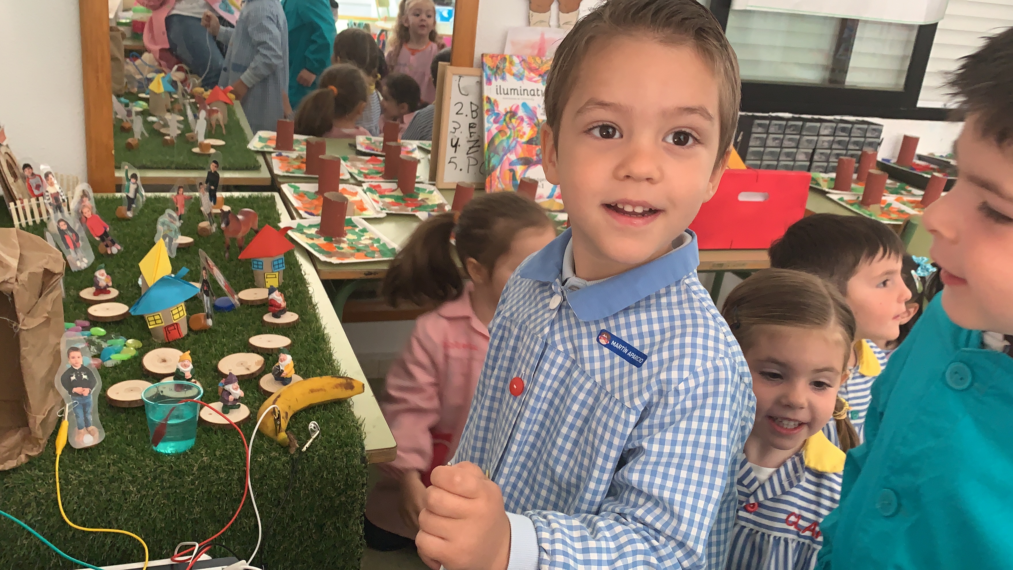 Los alumnos de 3 años del colegio Paseo Viejo de la Florida aprenden la vida en la naturaleza a través de hadas y nomos. Los pequeños se han adentrado en un bosque a través de David el Gnomo. Así, Así, una mañana al llegar a clase, se encontraron su paisaje de aprendizaje cambiado con cables y otros elementos como agua, plátano, un niño… “Un experimento” dijeron los pequeños. Descubrieron qué producían energía pues con una mano tocaban un cable que estaba conectado al ordenador, y con la otra mano tocaban el agua y el agua hablaba.