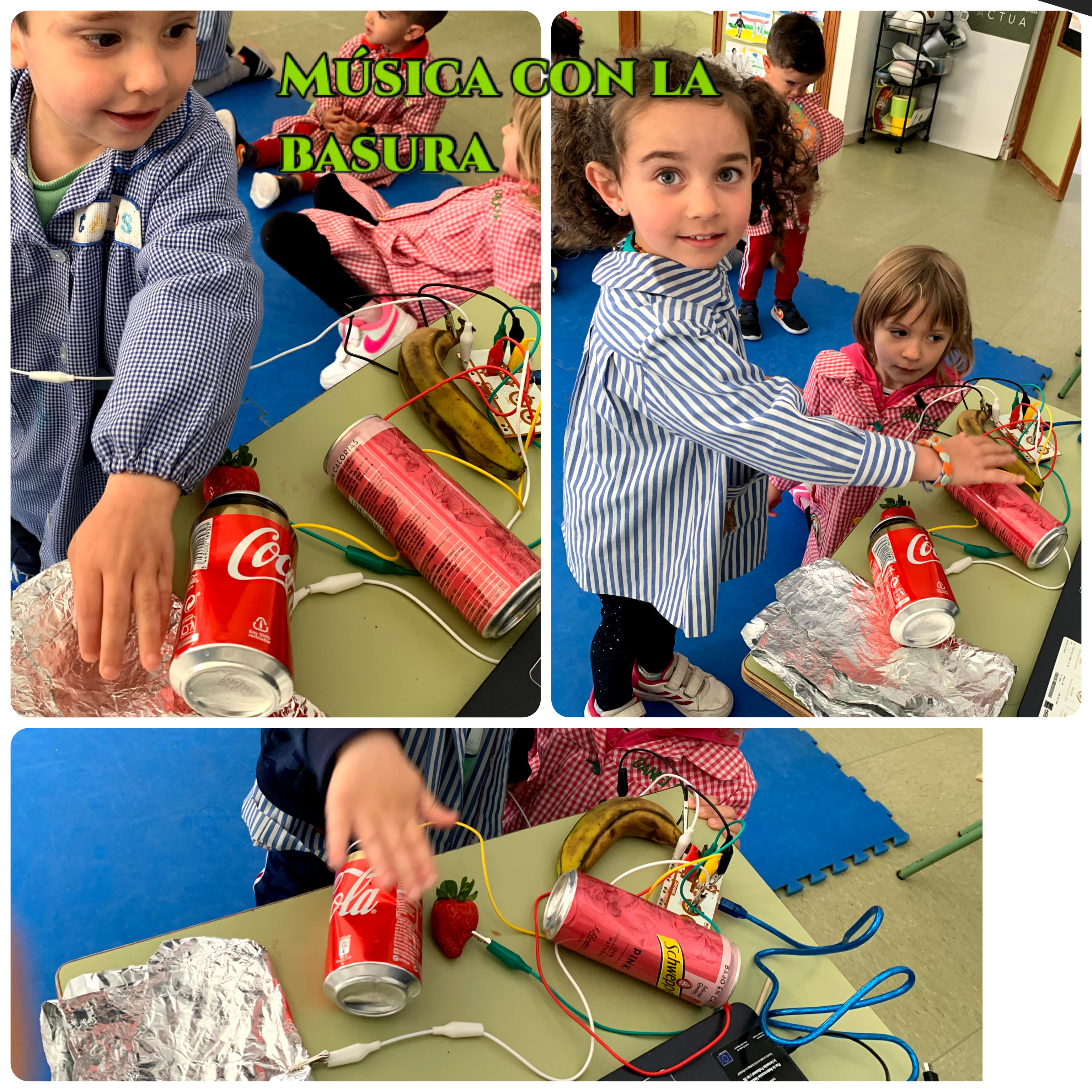 Por este motivo, “como no nos gustó lo que vimos decidimos, por un lado, reutilizar material que solemos tirar para crear juguetes, y por otro lado, usar esos cables que tanto nos gustaron para crear música con la basura”.