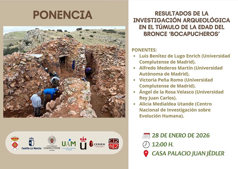 El próximo 28 de enero, a las 12:00 horas, la Casa Palacio Juan Jédler acogerá la conferencia titulada Resultados de la investigación arqueológica en el túmulo de la Edad del Bronce de Bocapucheros, en la que se darán a conocer los avances científicos obtenidos en este singular yacimiento arqueológico situado a seis kilómetros de la ciudad de Almagro.