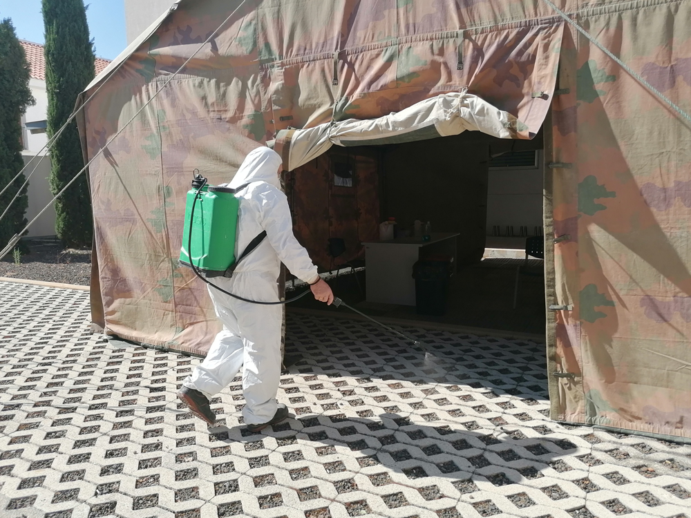 El Ayuntamiento de Almagro ha comenzado esta semana a desinfectar la carpa en la que se realizan las pruebas PCR a petición del centro de salud. También como medida de prevención, operarios municipales realizan labores de desinfección en los accesos de los tres colegios, de los dos institutos y de la guardería El arca de los sueños.