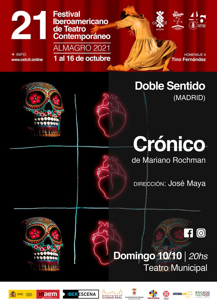 Durante domingo, lunes y martes, habrá una representación cada noche. El domingo a las 20 horas, sube al escenario del Teatro Municipal la compañía Doble Sentido de Madrid con “Crónico” de Mariano Rochman, una comedia donde se pone en cuestión hasta donde uno es capaz de llegar para sentirse bien. Doble sentido habla acerca del amor después de amor. Esa nada llamada desamor, un estado donde uno no sabe si está viviendo o soñando una pesadilla; sintiendo que queda poco aire por respirar y que sin esa persona amada la vida no tiene sentido.