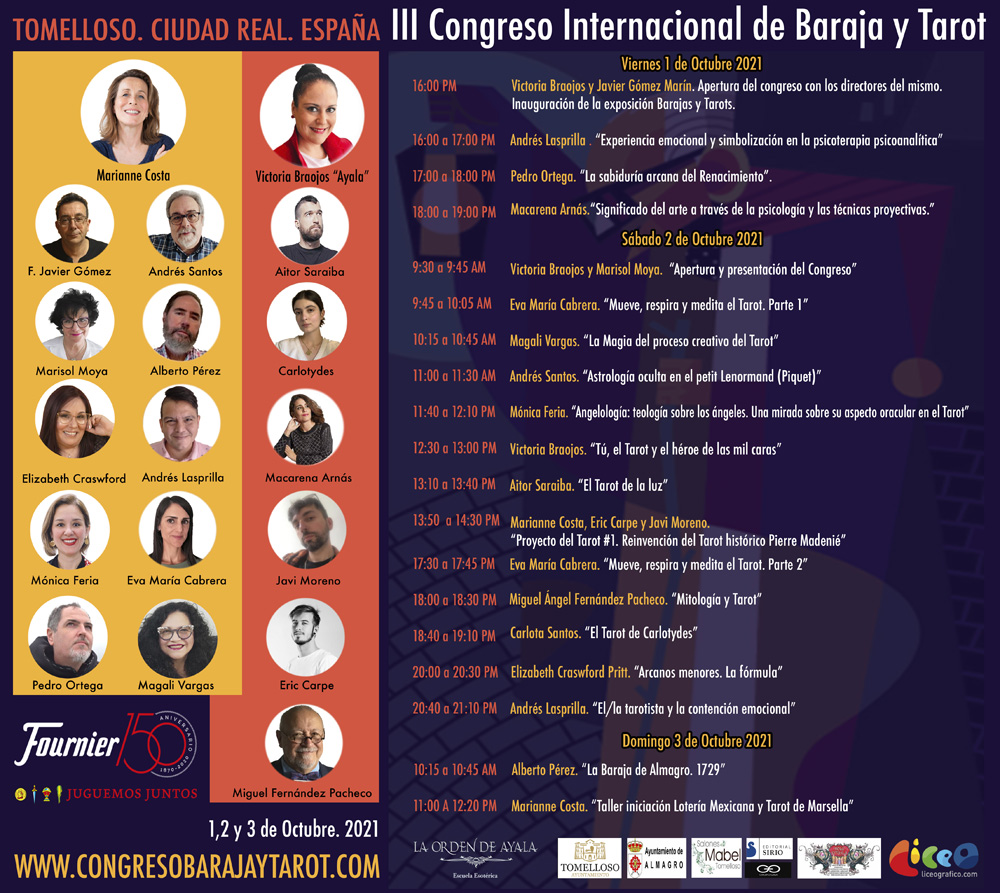 El próximo 1,2 y 3 de octubre del 2021 Tomelloso y Almagro se convertirán en punto de encuentro de más de 20 profesionales de la baraja, naipe y tarot procedentes de todo el mundo. El III Congreso internacional de Baraja y Tarot será un evento único que reunirá más de 120 barajas, tarots y libros de cartomancia mundial originales desde el Siglo XVIII, en una exposición que será la primera vez en España.