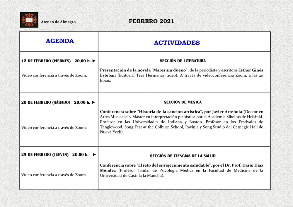 El Ateneo de Almagro se mantiene firme en su compromiso con la dinamización cultural de la ciudad a pesar de la pandemia y ha vuelto a dotar de contenido al mes de febrero con la propuesta de tres conferencias que se celebrarán, como viene siendo habitual en los últimos meses, en modalidad telemática abierta para todos los interesados.