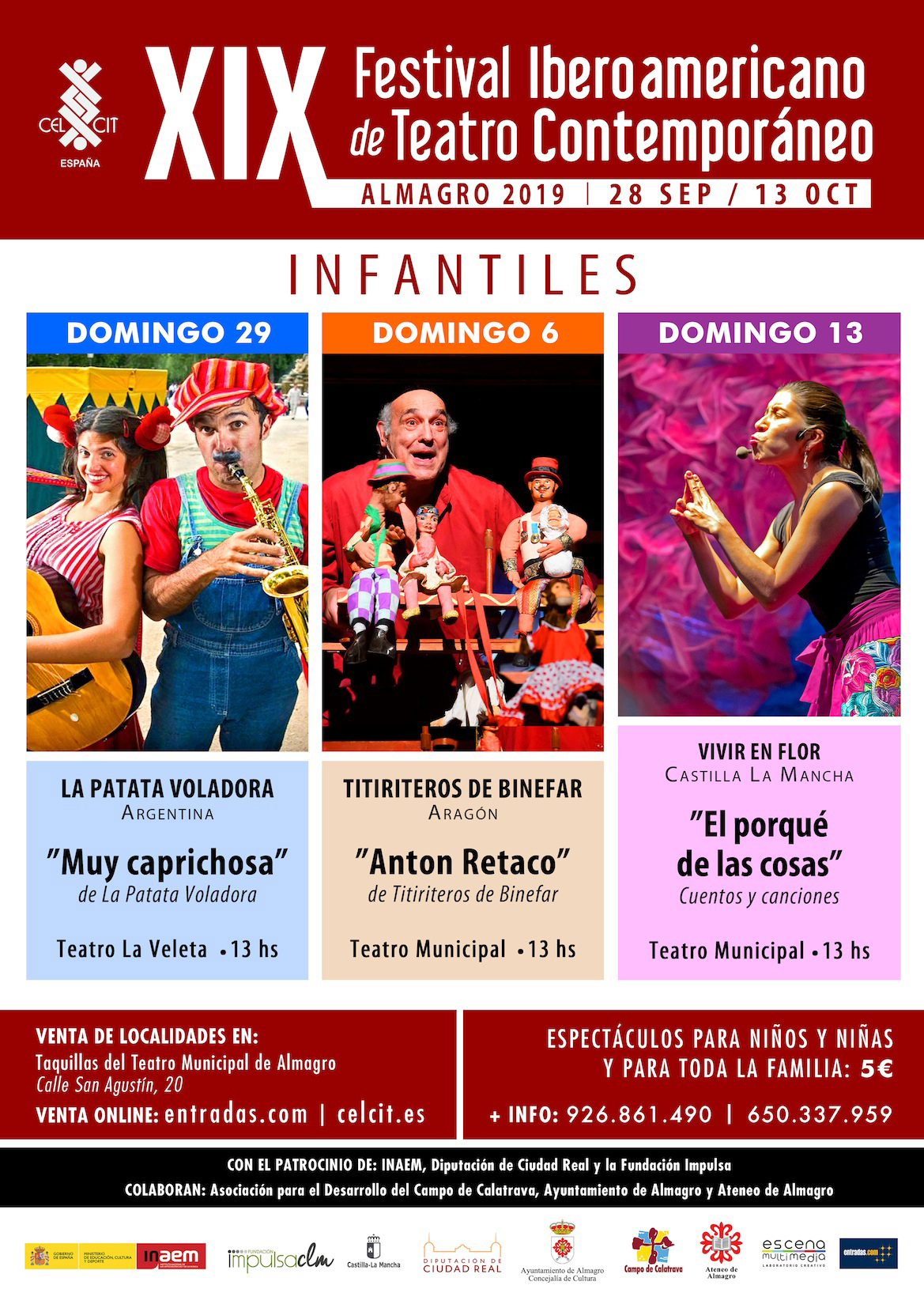 El XIX Festival Iberoamericano de Teatro Contemporáneo de Almagro ofrece tres espectáculos infantiles que despliegan creatividad, humor y valiosos mensajes para compartir en familia. Desde Argentina llega La Patata Voladora a La Veleta Teatro Laboratorio el domingo 29 de septiembre con el montaje Muy caprichosa; el domingo siguiente, 6 de octubre, los famosos Titiriteros de Binéfar llegan desde Aragón con la obra Antón Retaco, y el domingo 13 la clausura infantil estará a cargo de Vivir en Flor de Ciudad Real, con el espectáculo El porqué de las cosas o la edad de las porquerías, ambos en el Teatro Municipal.
