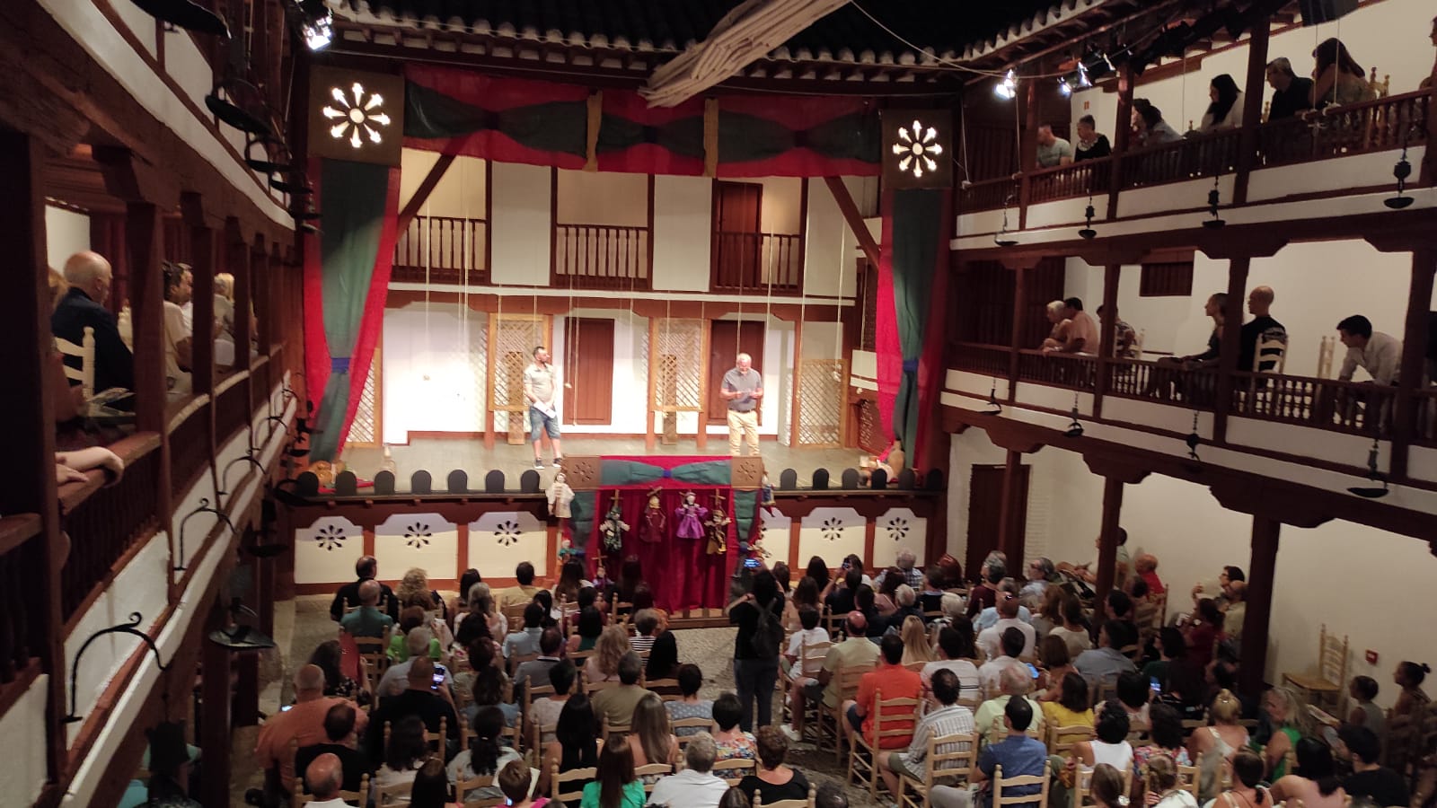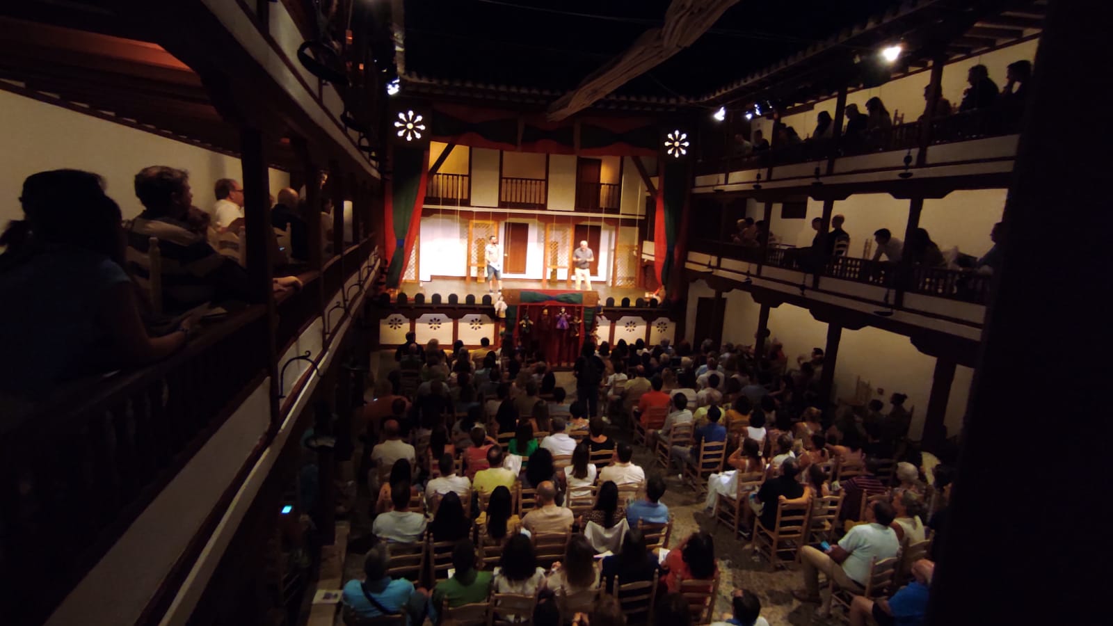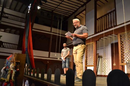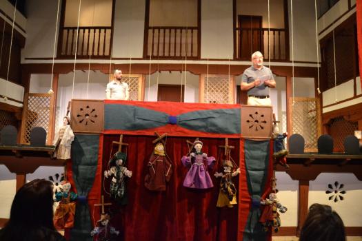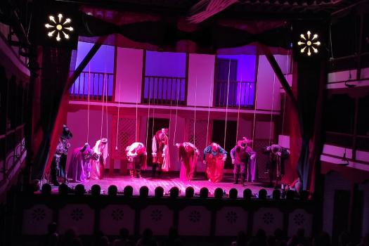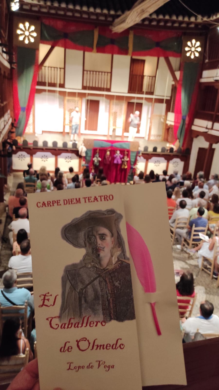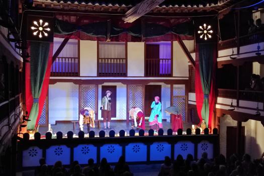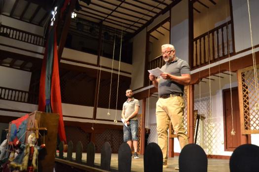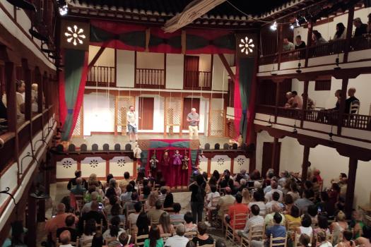 Ayer, el grupo de Tomelloso pudo subirse a las tablas del histórico corral, “un lujo” como fue calificado por su director, Miguel Ángel Berlanga. Carpe Diem presentó una adaptación de “El caballero de Olmedo” representado por una de esas compañías que recorrían las plazas de los pueblos para contar historias. En este caso con los títeres de Marcela y Pelayo. Unos títeres que se humanizan y sobre el escenario son Doña Inés, Fabia, Don Alonso, Tello… los personajes de El Caballero de Olmedo que ya convertidos en carne y hueso dan vida a la tragedia de Lope de Vega.