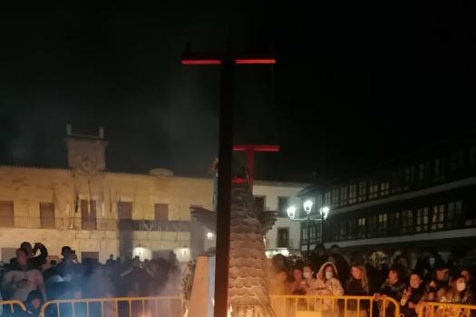 Un cortejo de mayorettes, vehículos antiguos y vecinos compungidos despiden a Doña Sardina antes de ser incinerada en la Plaza Mayor
