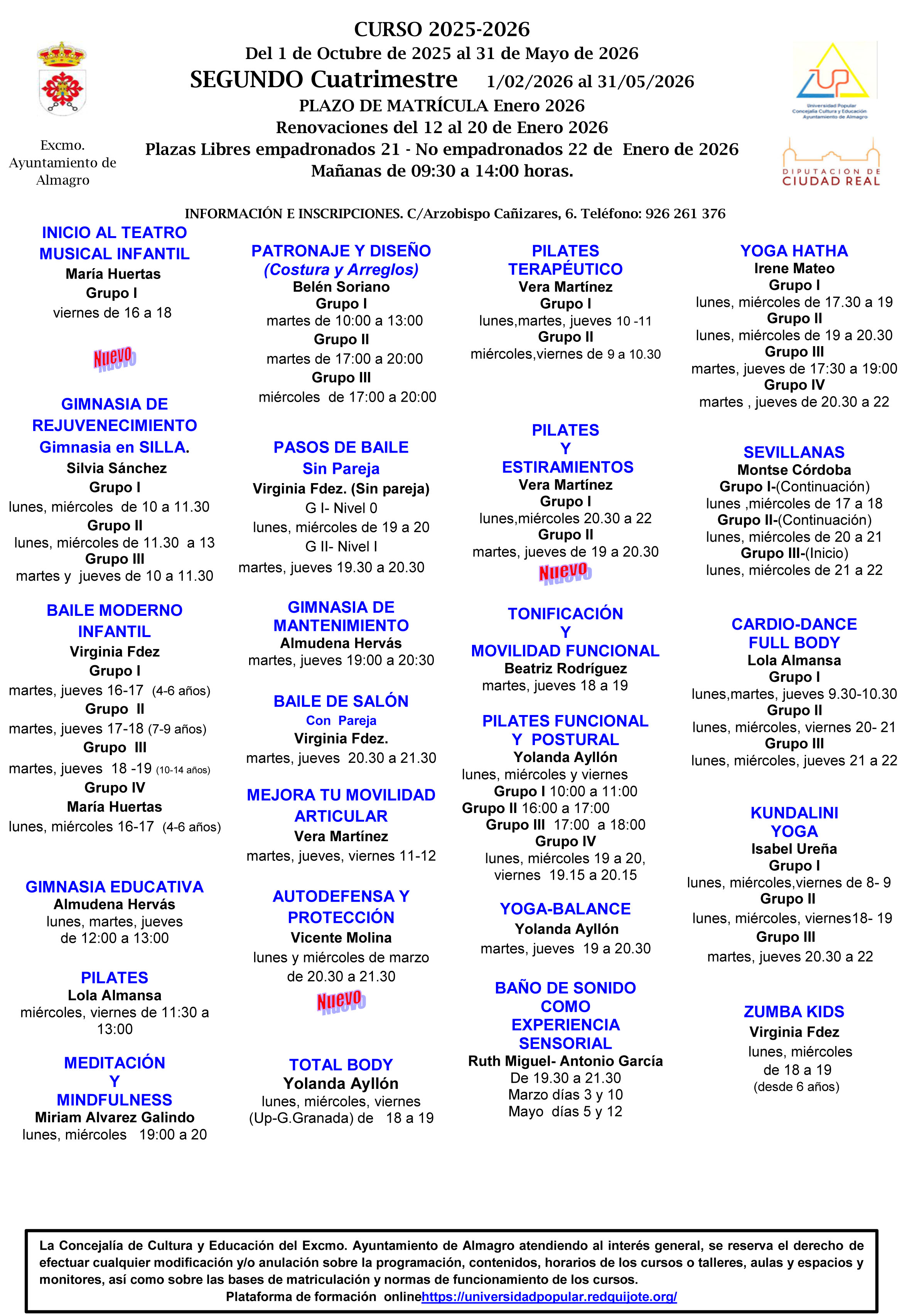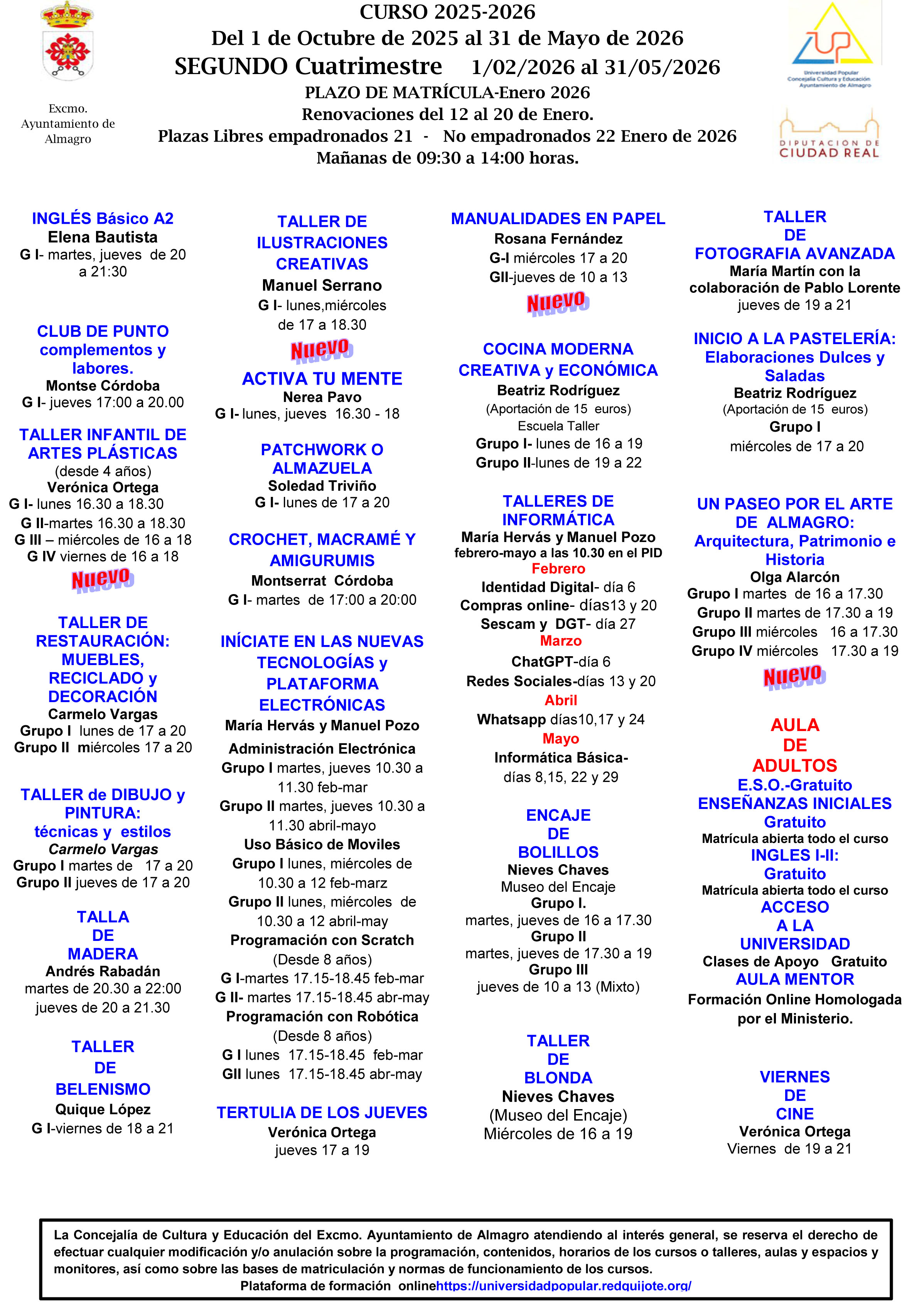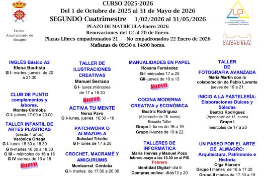 Plazas libres para EMPADRONADOS que no se inscribieron en el primer cuatrimestre, NUEVOS CURSOS y horarios. |