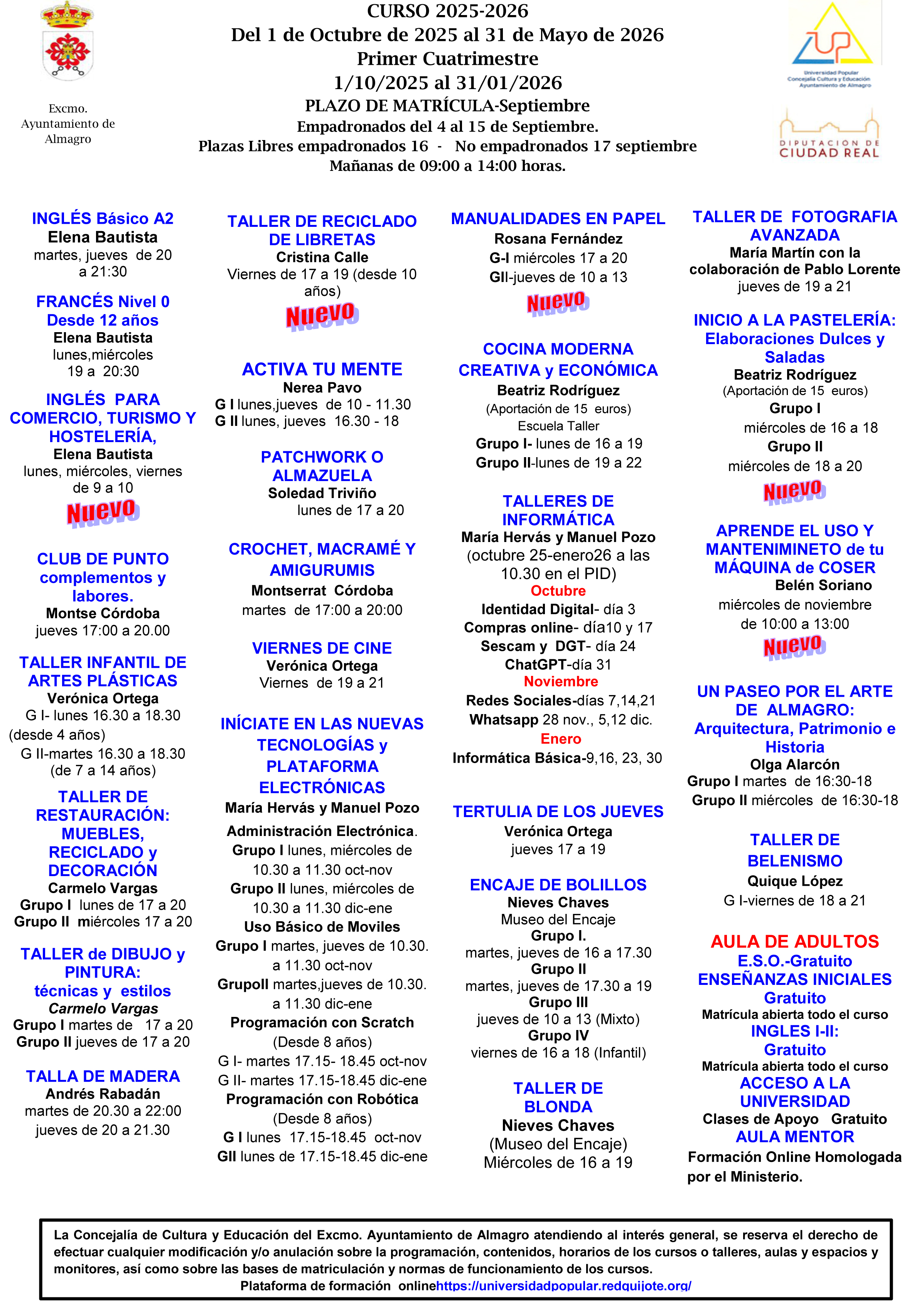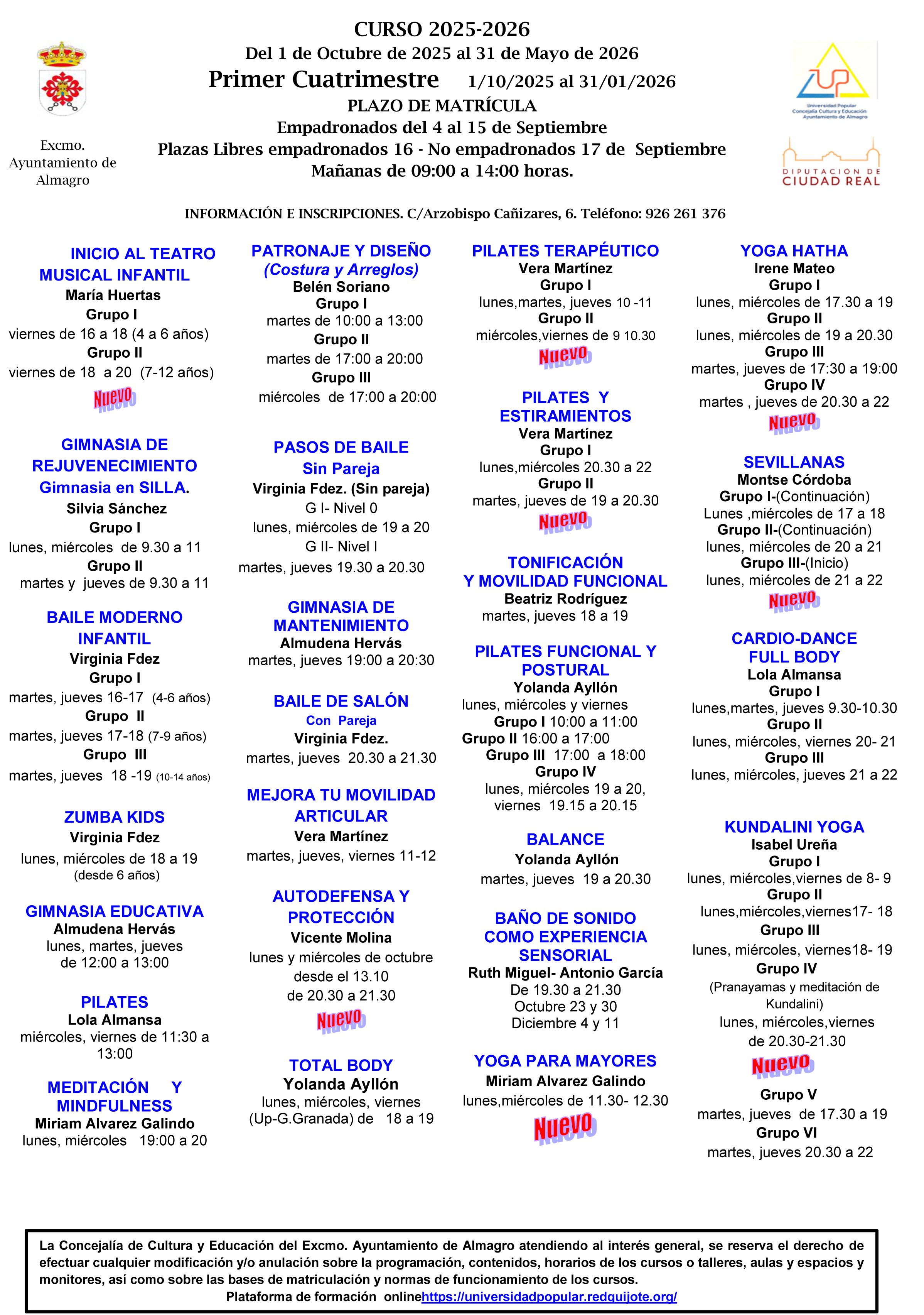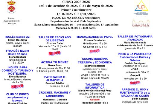 - Los alumnos matriculados durante el 1º cuatrimestre del curso 2025-2026 podrán reservar su plaza para el 2º cuatrimestre del curso. En enero deberán realizar el pago de la tasa correspondiente al nuevo periodo en las fechas que a tal efecto se indiquen en la oficina y tablones de la U.P. Las plazas no reservadas quedarán disponibles para el nuevo plazo de matrícula de Enero de 2026.