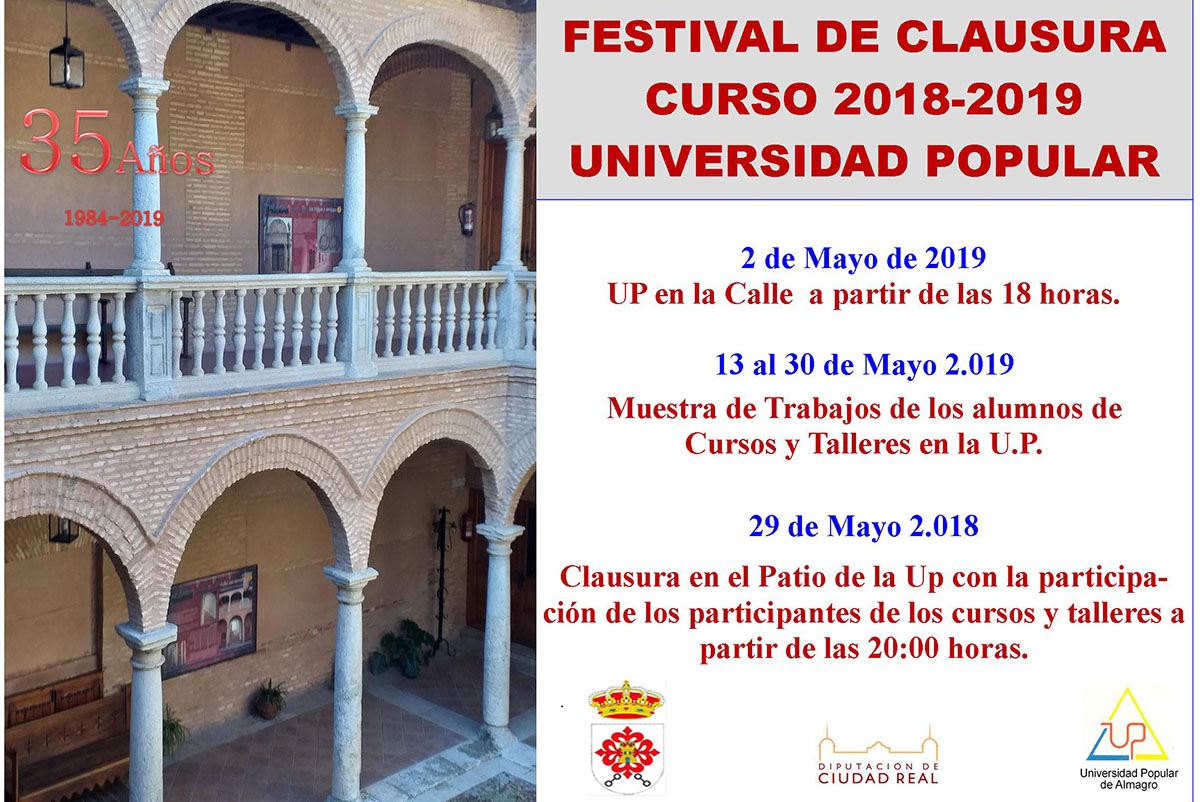 • 29 de Mayo: Clausura en el patio de la UP con la participación de los cursos y talleres a partir de las 20:00 h.