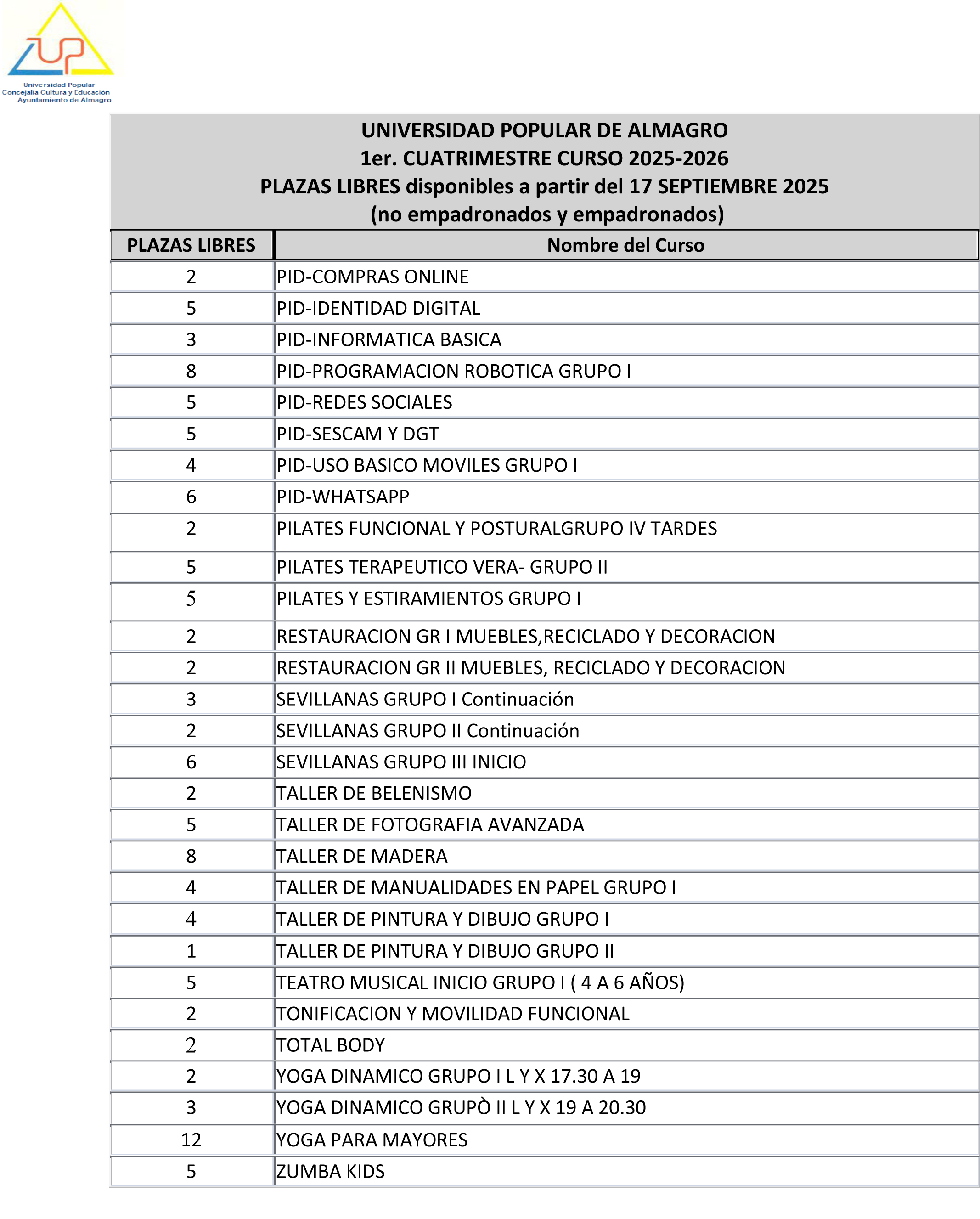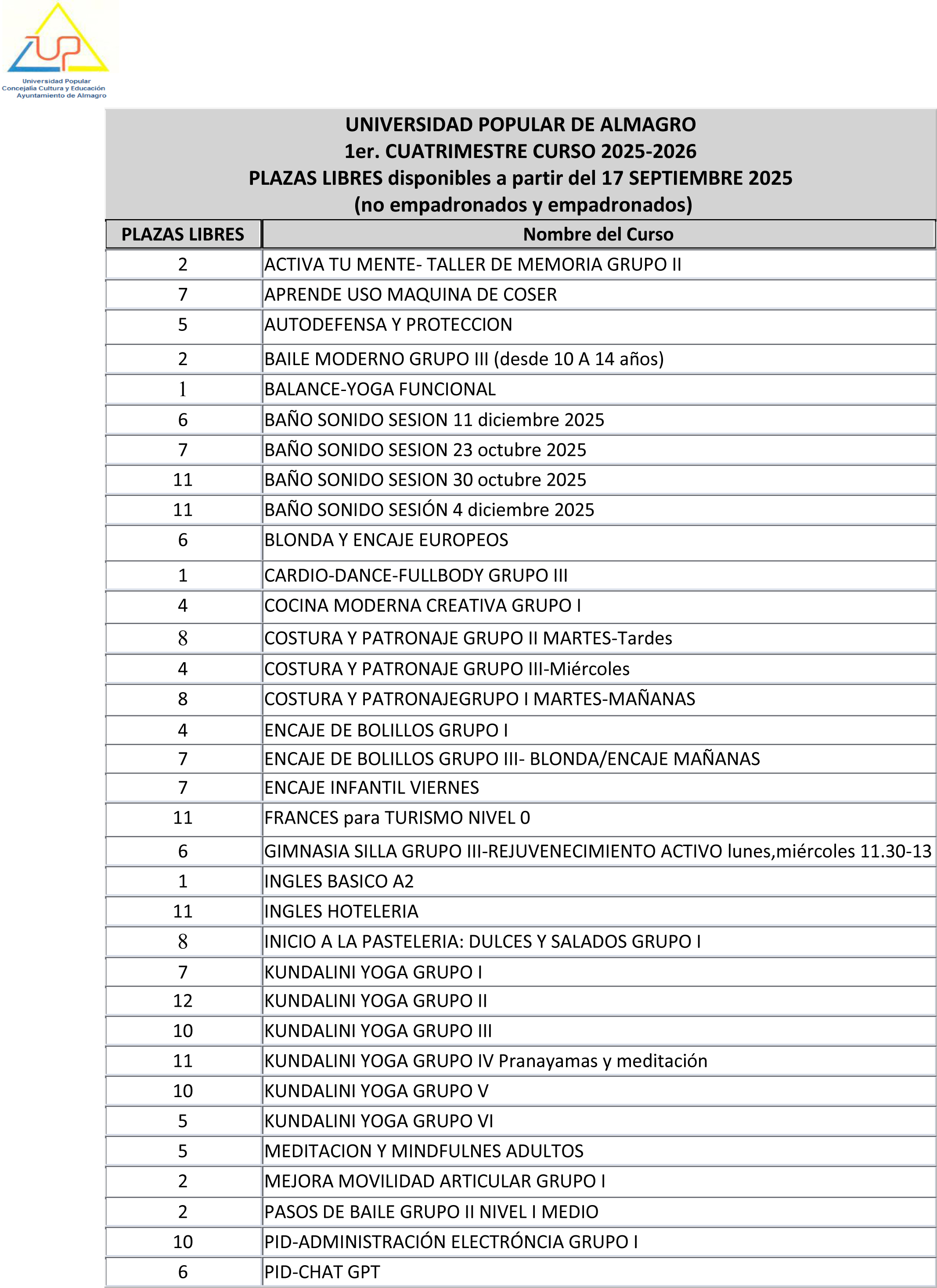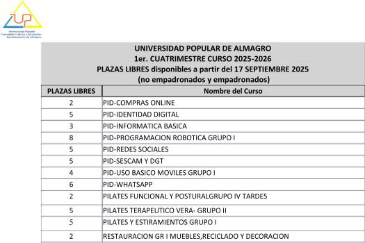 PLAZAS LIBRES disponibles a partir del 17 SEPTIEMBRE 2025 (no empadronados y empadronados)