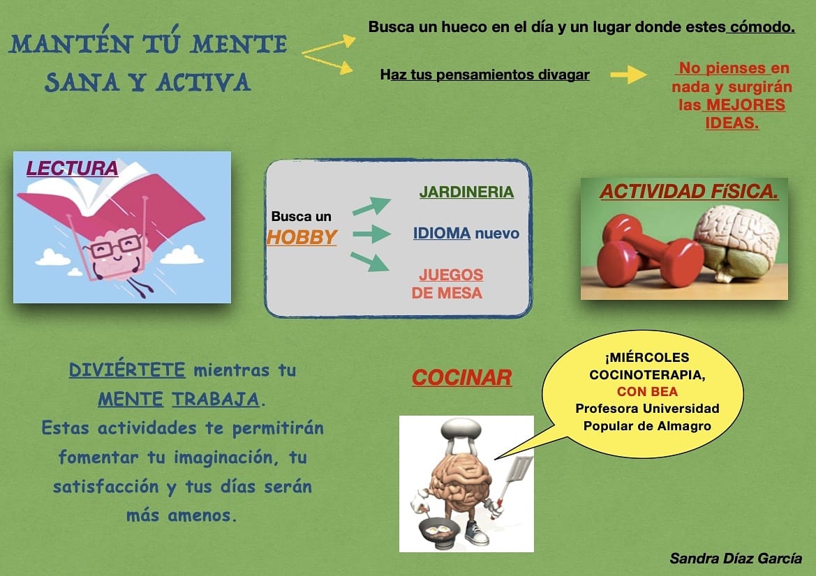 Esta semana tenemos imágenes de la evolución de los trabajos del Taller de Pintura y Taller de Restauración de muebles y objetos. Tenemos también clases Yoga y Zumba. Una deliciosa Receta de Cocina. Un interesante monográfico sobre la Semana Santa de Almagro elaborado por el Taller de Historia. También Actividades del Taller de Memoria y Psicología Positiva e Imágenes con Posters relacionados con las lecturas del día del Libro, Cocinoterapia, Arteterapia de diversos grupos.