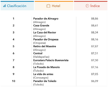 Los hoteles de las primeras posiciones del ranking son establecimientos ubicados edificios históricos, con marcadas referencias a la cultura local y que preservan elementos arquitectónicos, como es el caso del Parador de Almagro y La Casa del Rector, un hotel boutique en una antigua casa solariega del siglo XVII; o la Posada de Manolo en Toledo, cuyas plantas están ambientadas en las tres culturas que convivieron en la ciudad, publica entre otros medios el Digital de Castilla-La Mancha. Entre los primeros hoteles del ranking se encuentran tres Paradores: el de Almagro, Oropesa y Toledo, el cual ofrece una panorámica inigualable de la Ciudad Imperial. Solo un hotel de 5 estrellas, el Eurostars Palacio Buenavista, logra posicionarse entre los 10 primeros. Es un lujoso establecimiento construido alrededor del antiguo palacio del siglo XVI y se encuentra a las afueras de la ciudad de Toledo. El listado de los diez hoteles mejor valorados en Castilla-La Mancha, según trivago.es, es el siguiente, publicado en varios medios digitales: