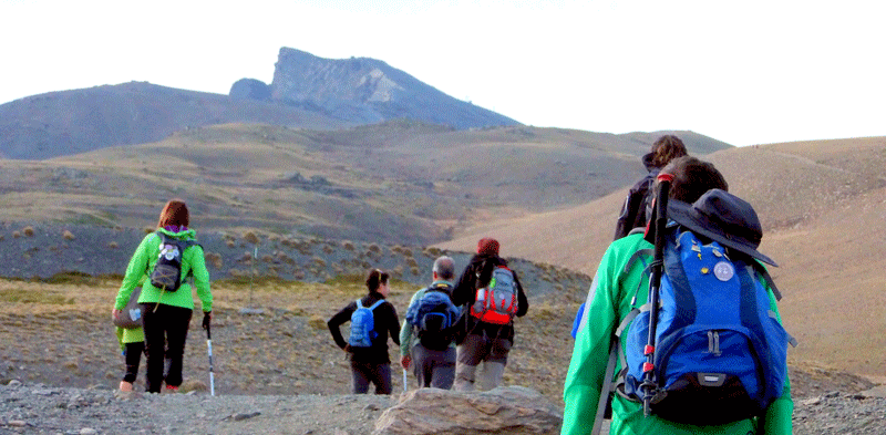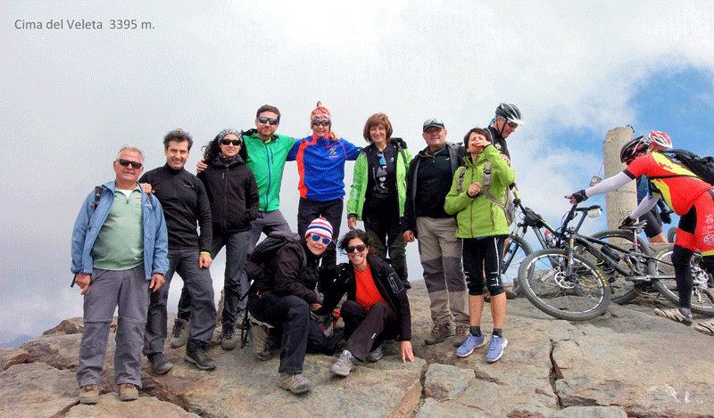 Llegados a cierto punto de ascensión, el grupo decidió tomar un sendero que sale a la izquierda y que tras una súbita bajada, y una subida vertical, te lleva al pico de los Machos con sus 3327 metros de altitud.” Este tramo es más complicado que seguir el camino directo de subida al Veleta, pero al mismo tiempo es de una gran belleza, te da una visión de todas las caras del Veleta”.