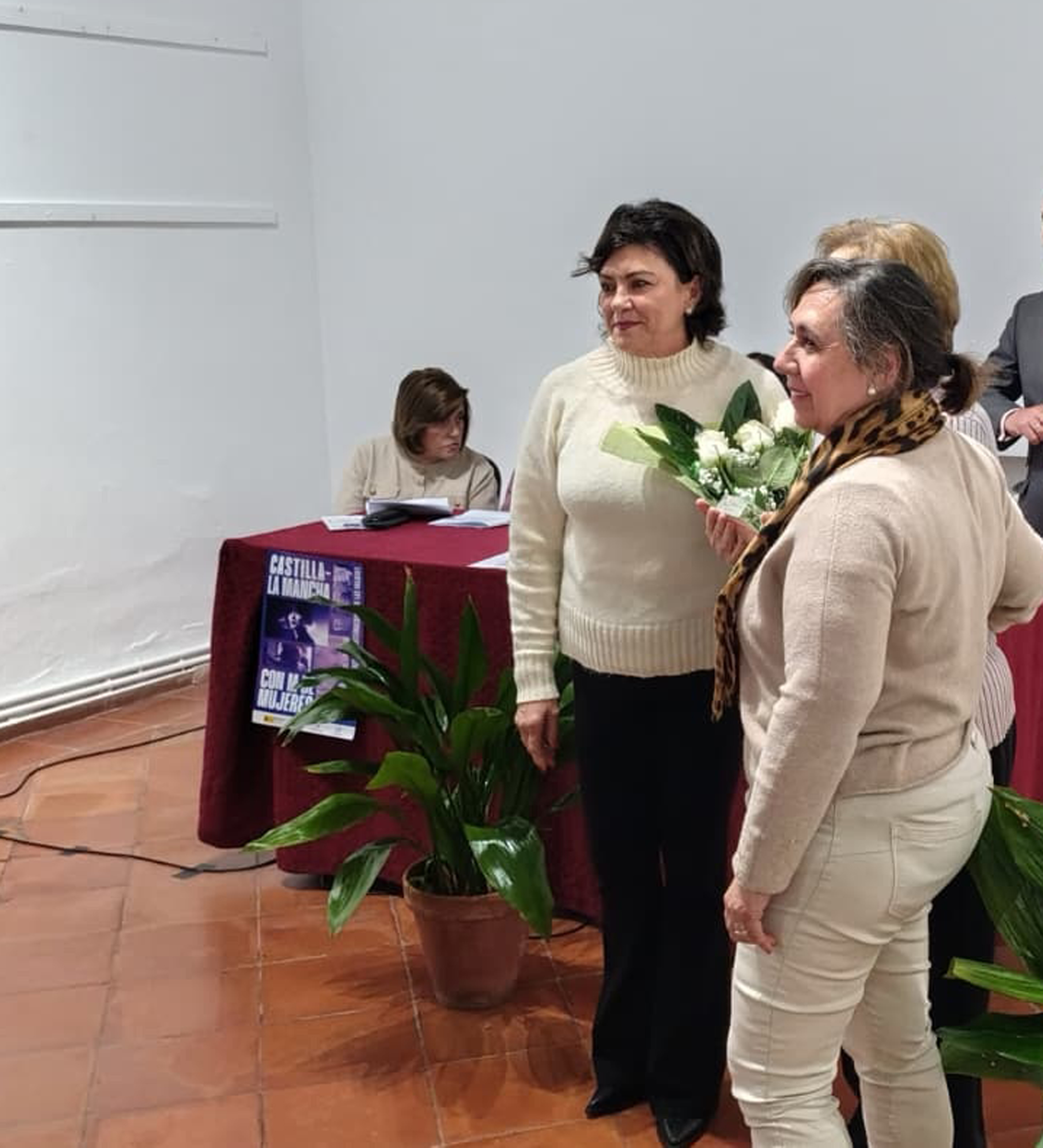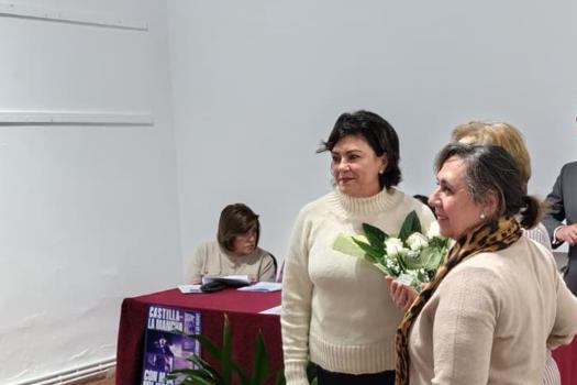 Tras estas palabras, otras dos representantes de las asociaciones de mujeres de la ciudad entregaron a Pepa Delmas un ramo de flores y una placa en la que se puede leer: “Las Asociaciones de Mujeres de Almagro en reconocimiento a Pepa Delmas Rodríguez, primera alcaldesa de Almagro en democracia, maestra modelo, ejemplo y faro de varias generaciones.”