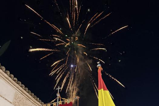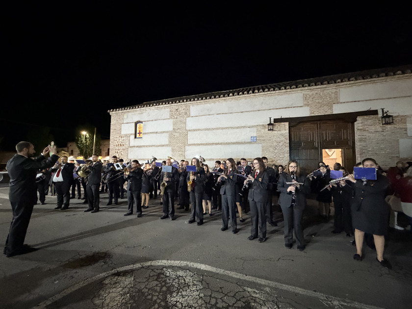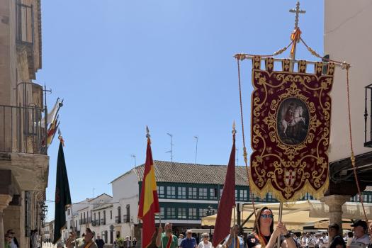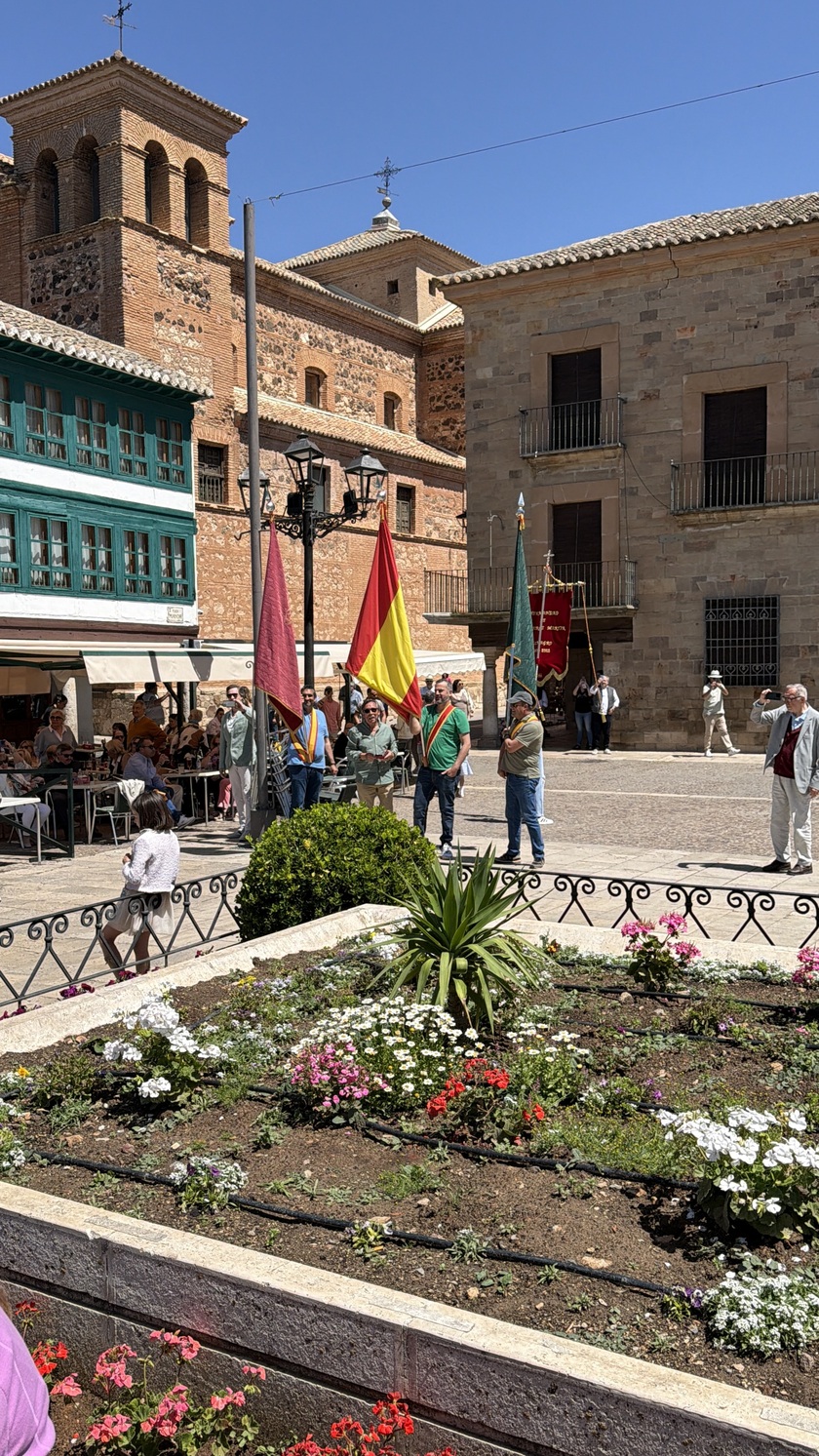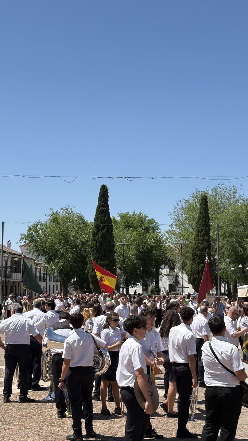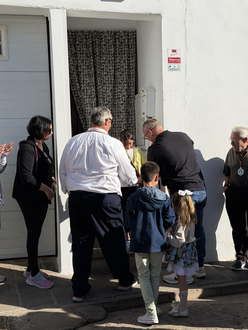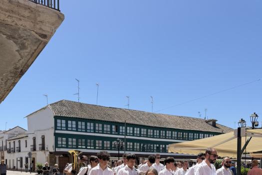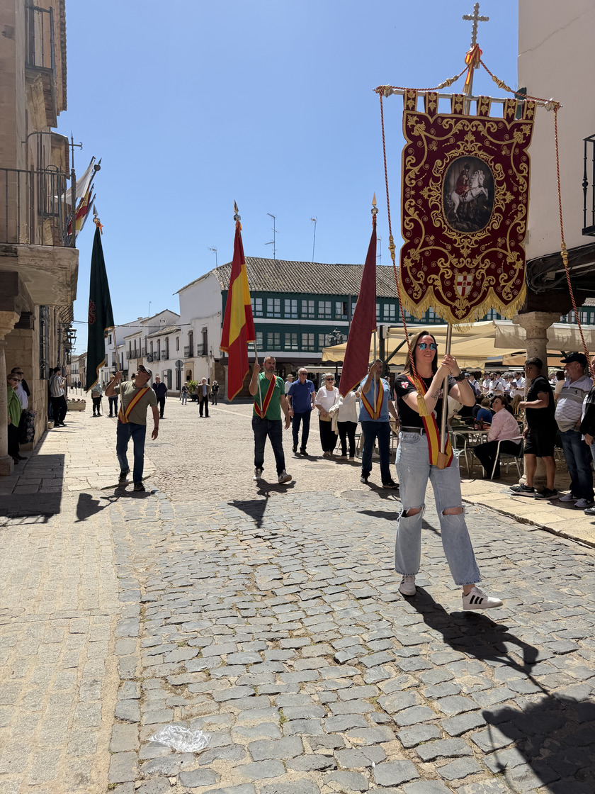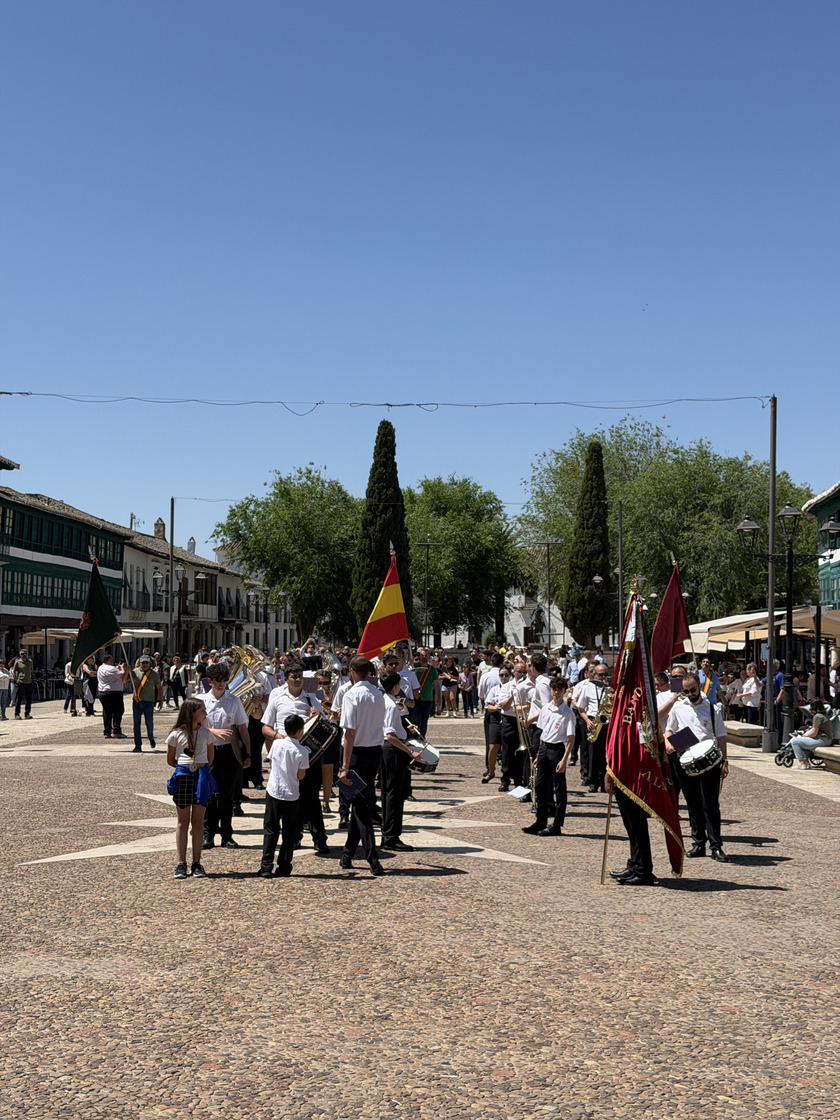 El domingo por la mañana, desde las 9:30 horas, los Hermanos y Abanderados, junto a la Banda Municipal de Música, participaron en el tradicional pasacalles para recoger a la capitana María Juan Arenas, y visitando los domicilios de los Abanderados. Un recorrido que se extendió por buena parte del municipio, como la llegada al Centro de Mayores para amenizar la mañana con música y baile, y también, pasando por algunos de sus enclaves más representativos, como la Plaza Mayor. Precisamente en este espacio, uno de los más emblemáticos de la localidad, la Banda de Música de Almagro interpretó una pieza especial en honor al presidente de la Hermandad, con motivo de su último año en el cargo, en uno de los momentos más significativos de la jornada. En el marco de la celebración se dieron a conocer las demás insignias para el año 2026: Leticia Serrano Vargas y El Civilillo serán la 1ª Bandera; Gregorio Arenas García, la 2ª Bandera; y Pepe y Fermín, la 3ª Bandera.