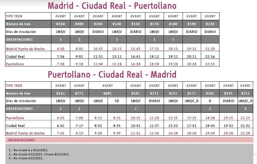 En sentido contrario, los horarios establecidos por Renfe para la línea Puertollano-Ciudad Real-Madrid quedarían de la siguiente manera: 8.15, 11.20, 19.15 horas en fin de semana, ampliando estas frecuencias los domingos a las 18.28 y a las 21.15 horas.