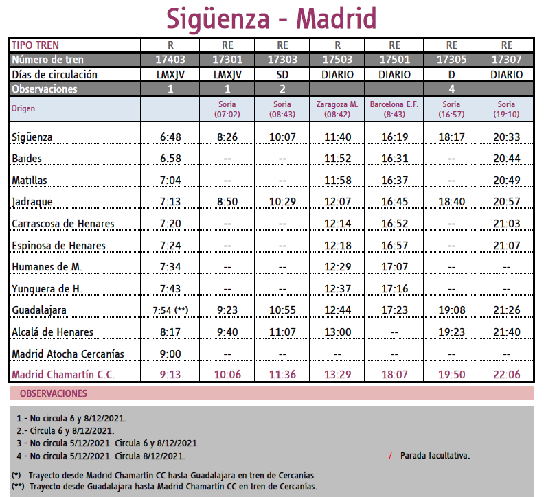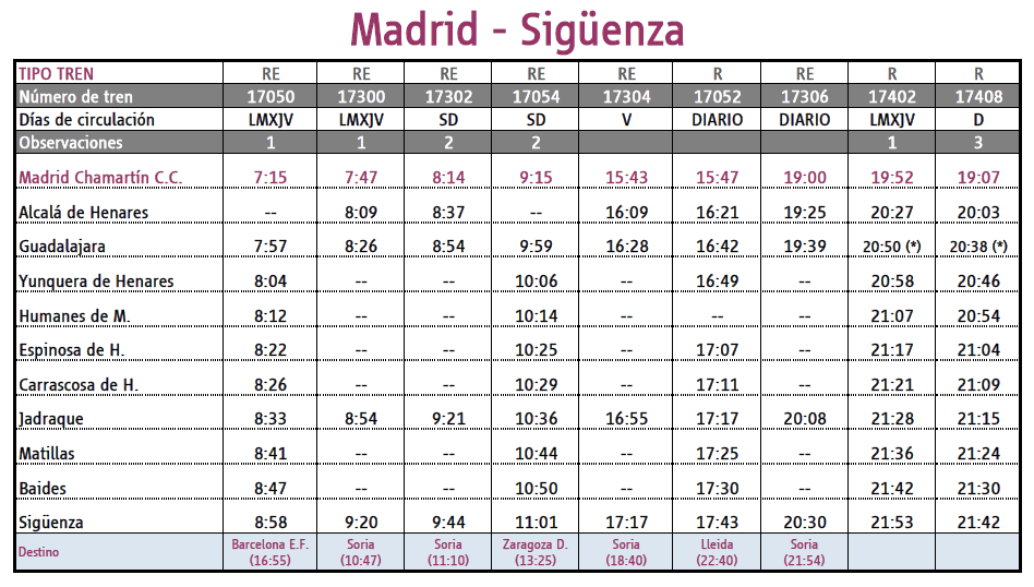 En cuanto al Corredor del Alto Henares, Renfe restablece el tren Regional de retorno los domingos a última hora de Madrid a Sigüenza. A partir de este domingo 7 de noviembre entrará en funcionamiento el tren de las 19.07 horas con salida Madrid Chamartín, efectuando parada en toda la línea: Alcalá de Henares, Guadalajara, Yunquera de Henares, Humanes de M., Espinosa de H., Carrascosa de H., Jadraque, Matillas, Baides y Sigüenza.