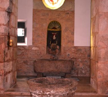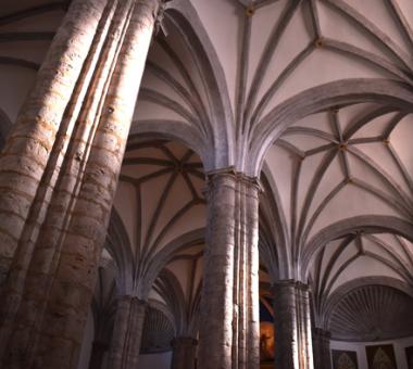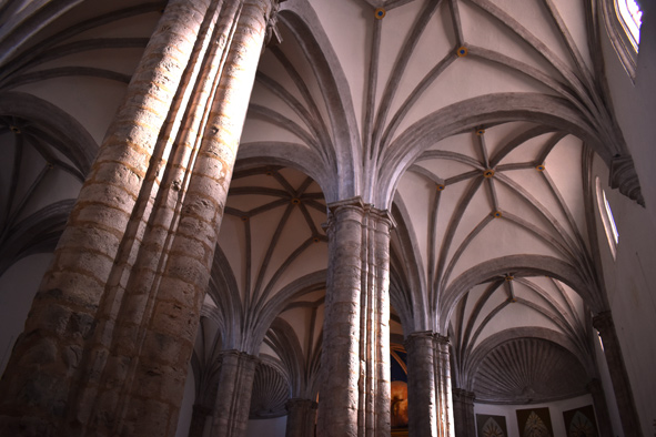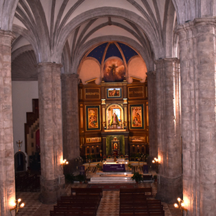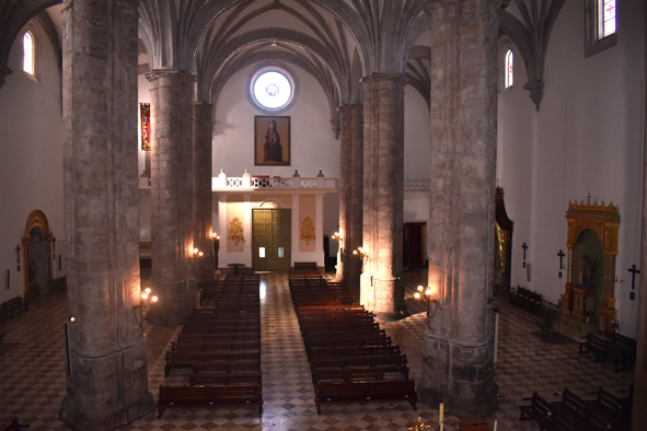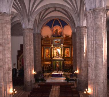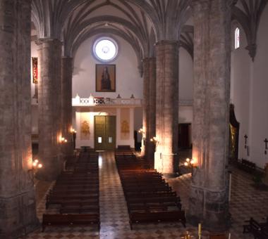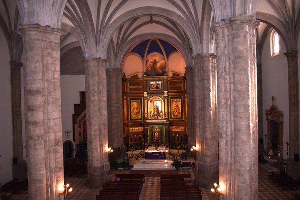 Las arcadas descansan sobre seis pilares cruciformes de piedra que tienen adosadas medias columnas toscanas con basamento semicircular. Las tres naves desembocan en ábsides poligonales, siendo el de la capilla mayor pentagonal y cubierto por bóveda nervada, y los laterales de tres lados cubiertos por veneras o conchas. En el muro, de una gran solidez, se abren altas ventanas formadas por arcos de medio punto que dan a luz un claro sentido renacentista en oposición a las vidrieras del mundo gótico.