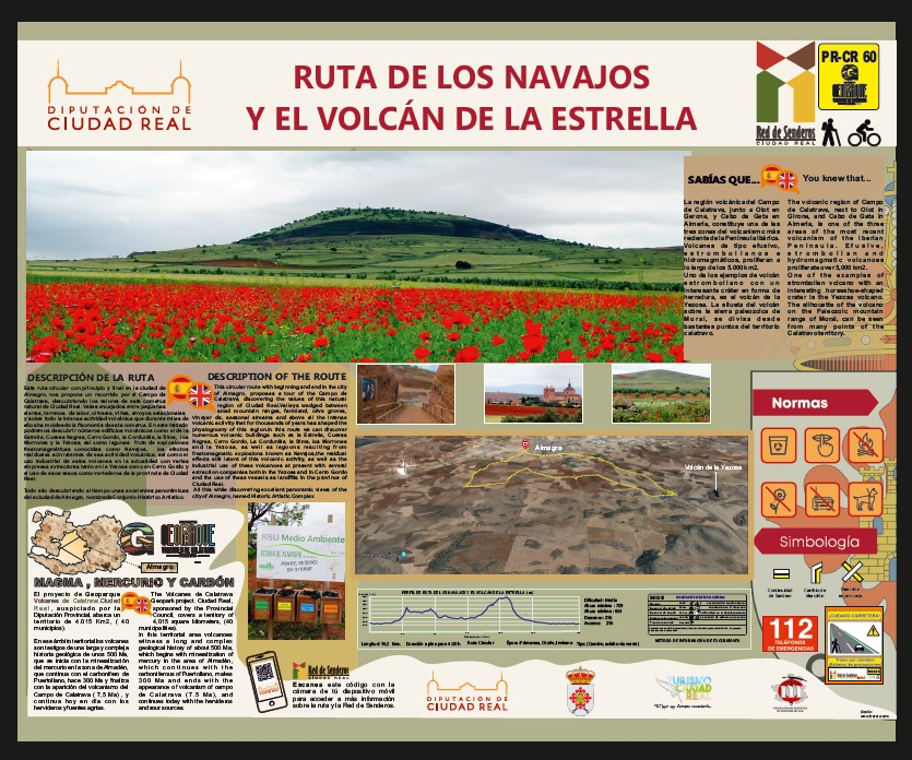 Esta ruta circular con principio y final en la ciudad de Almagro nos propone un recorrido de 16 kilómetros por el Campo de Calatrava, descubriendo los valores de esta comarca natural de Ciudad Real. Valles encajados entre pequeñas sierras, terrenos de labor, olivares, viñas, arroyos estacionales y sobre todo la intensa actividad volcánica que durante miles de años ha moldeado la fisonomía de esta comarca. En este trazado podremos descubrir numerosos edificios volcánicos como el de la Estrella, Cuevas Negras, Cerro Gordo, la Cornudilla, la Sima, los Morrones y la Yezosa, así como lagunas fruto de explosiones freatomagmáticas conocidas como Navajos, los efectos residuales aún latentes de esa actividad volcánica, así como el uso industrial de estos volcanes en la actualidad con varias empresas extractoras tanto en la Yezosa como en Cerro Gordo y el uso de esos vasos como vertederos de la provincia de Ciudad Real.